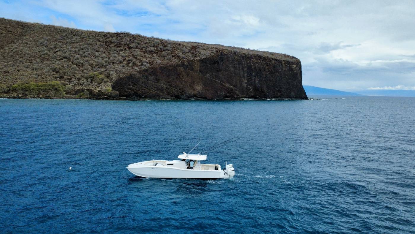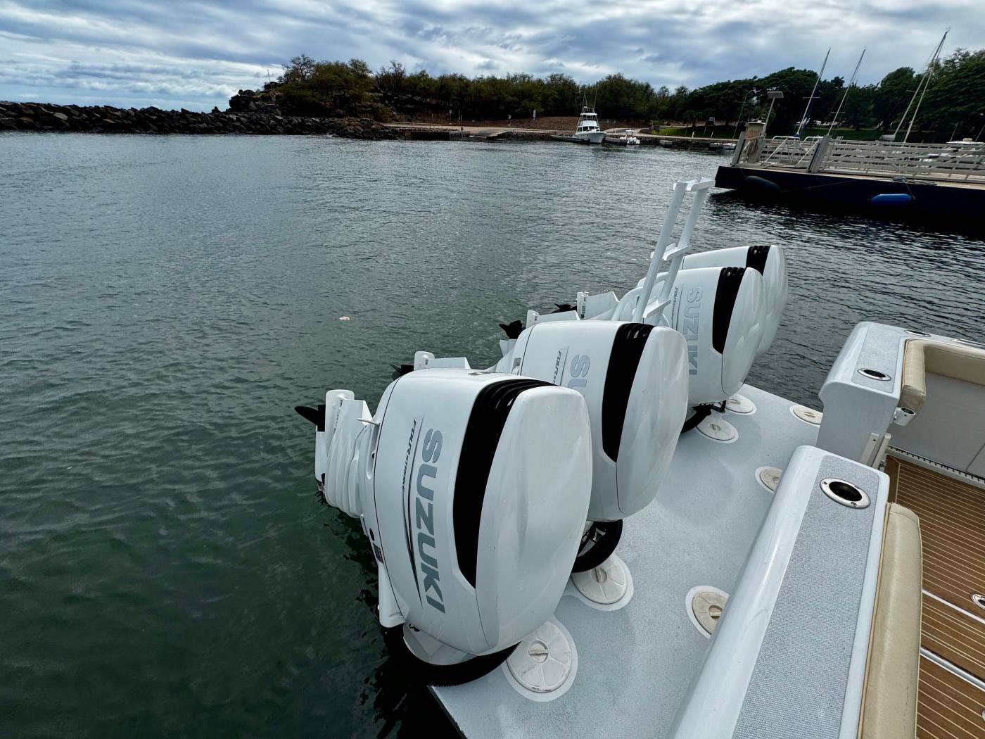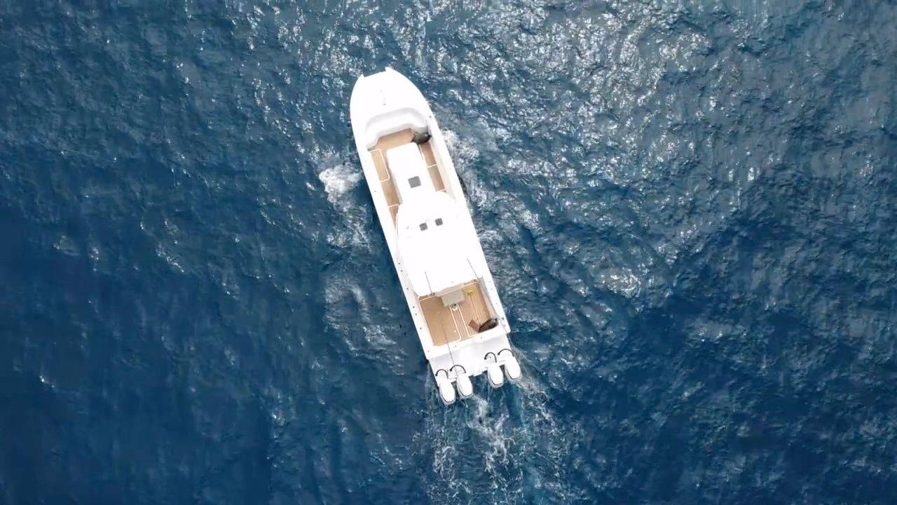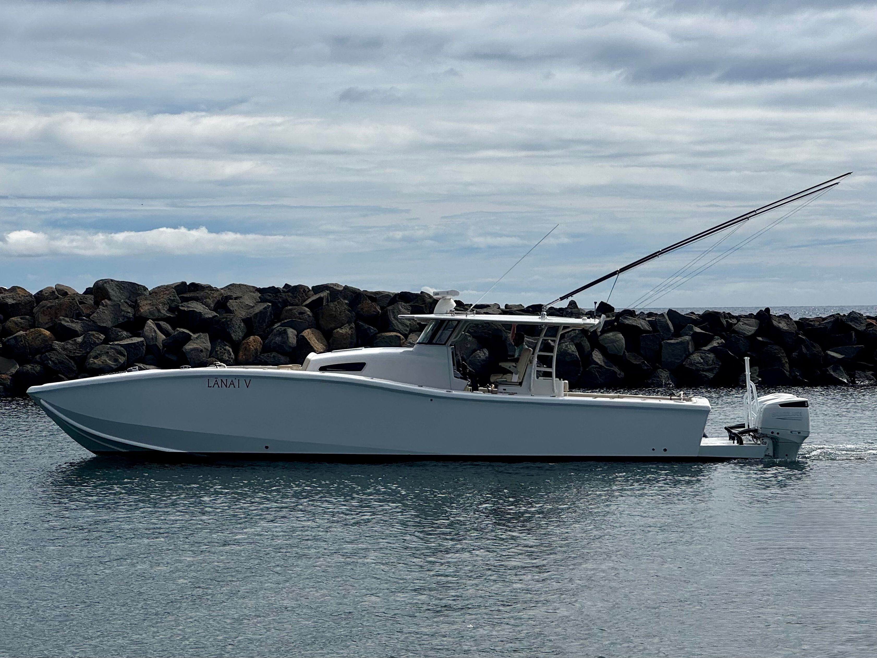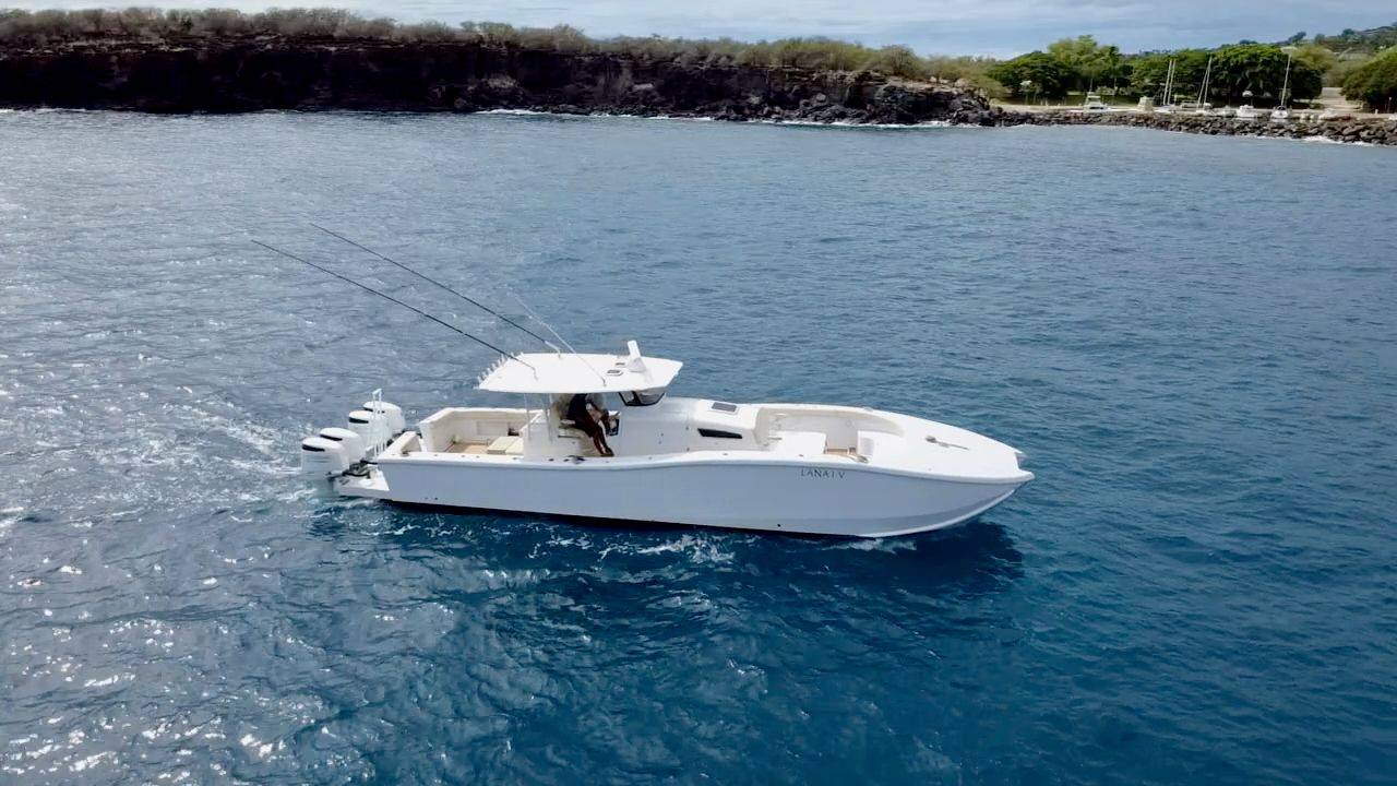 It features an asymmetrical stepped hull for sharp handling and a wide beam for spacious "runaround room". The i45 blends luxury amenities such as sleeping quarters, a head, oversized T-Top, LeBroc seating, JL and Fusion audio, plus high-performance capabilities including quad Suzuki 300's, Optimus steering, and full electronics package for any offshore excursion.