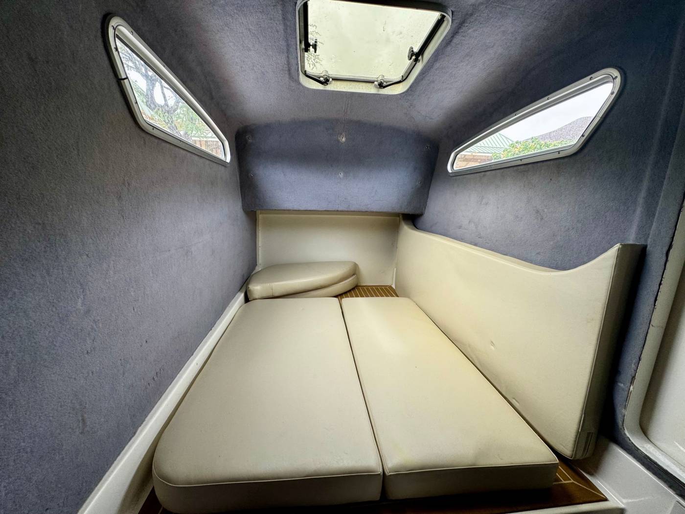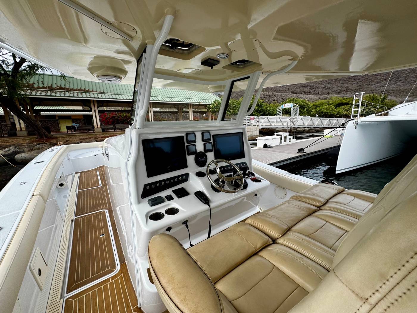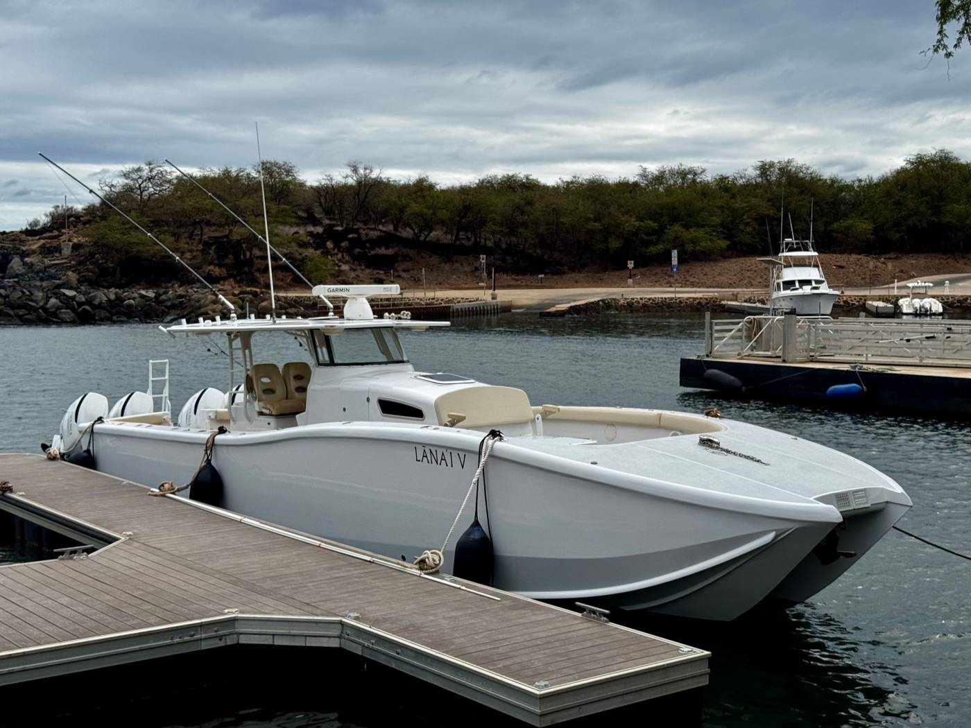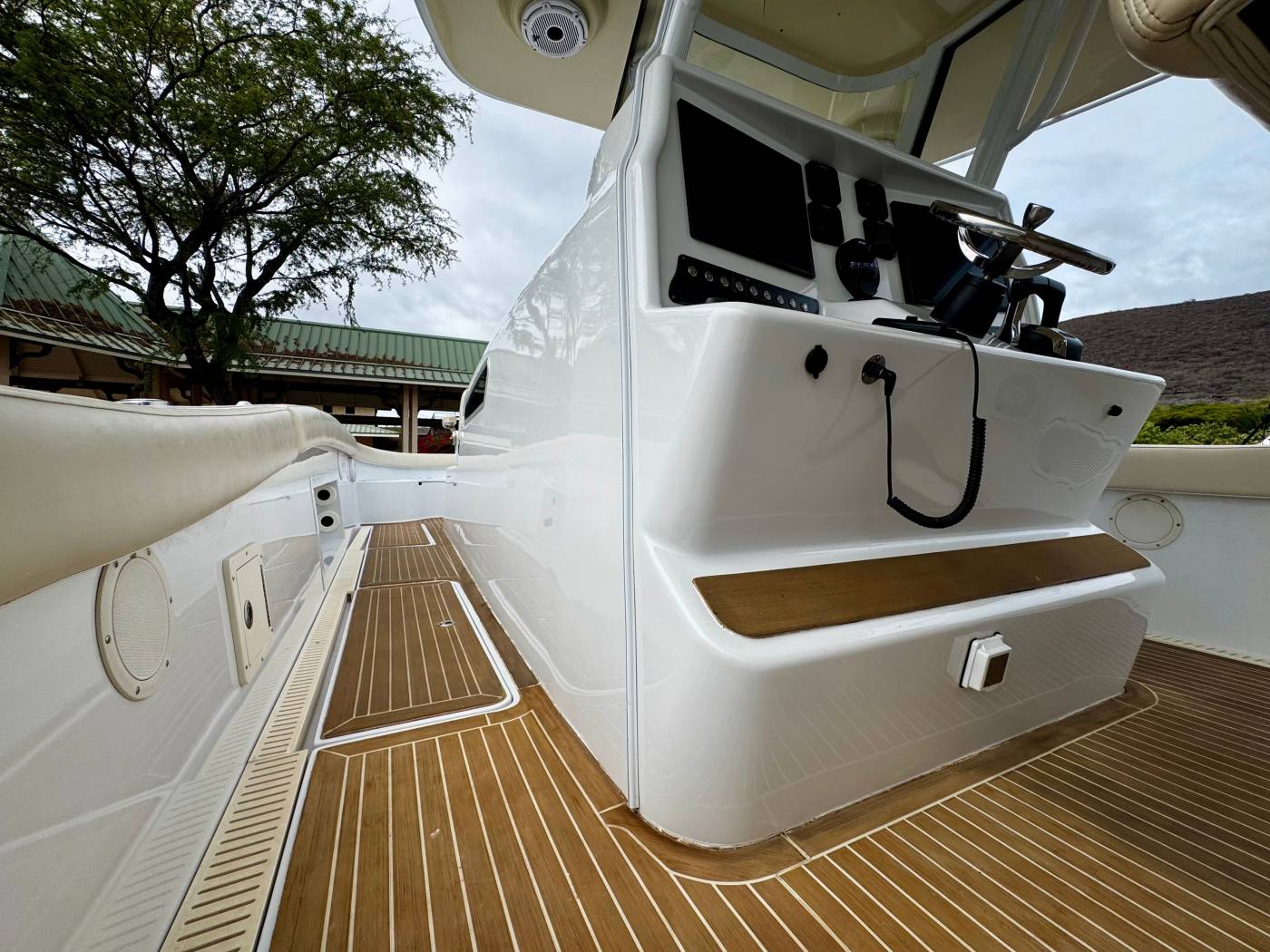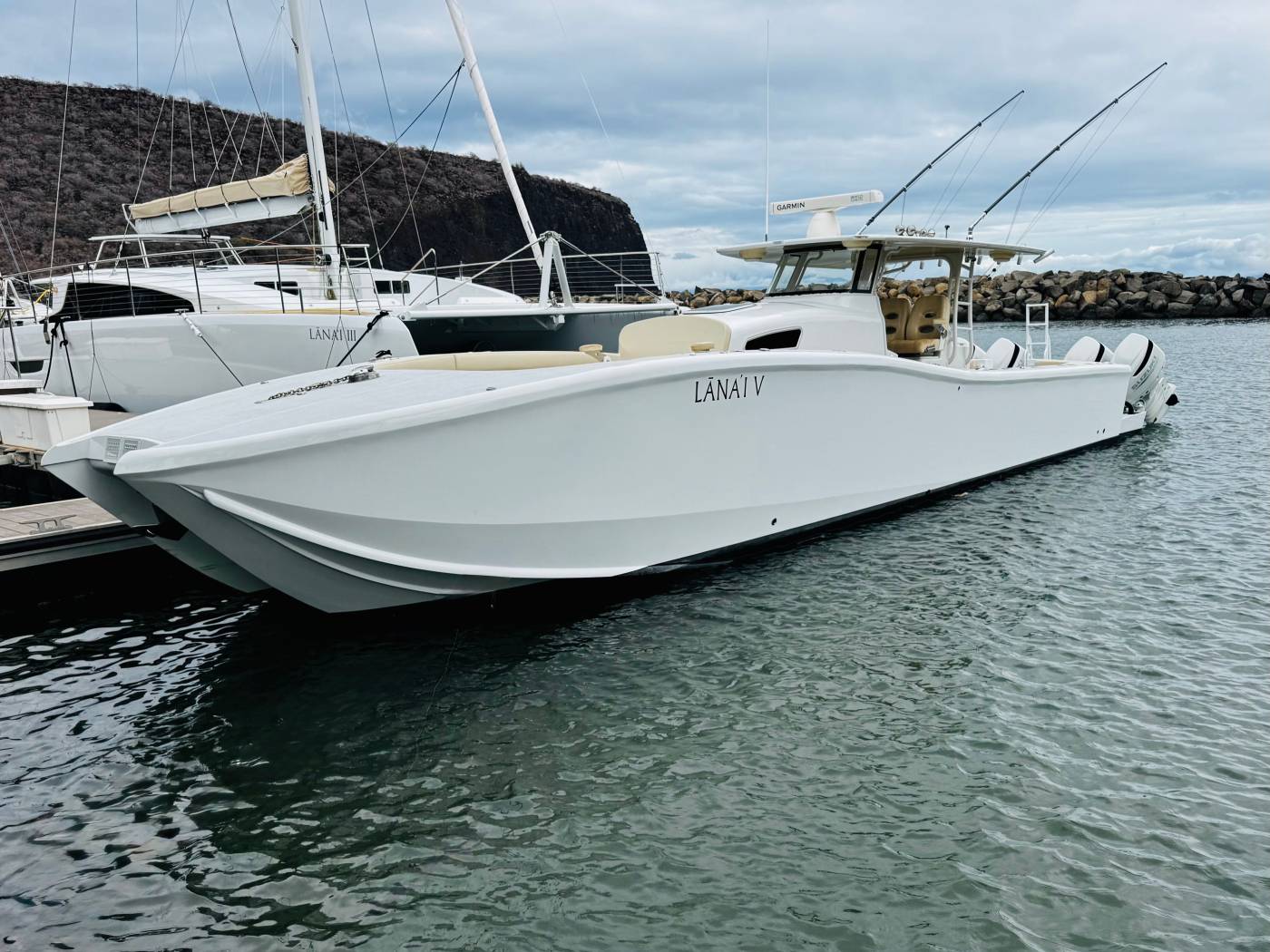 It features an asymmetrical stepped hull for sharp handling and a wide beam for spacious "runaround room". The i45 blends luxury amenities such as sleeping quarters, a head, oversized T-Top, LeBroc seating, JL and Fusion audio, plus high-performance capabilities including quad Suzuki 300's, Optimus steering, and full electronics package for any offshore excursion.