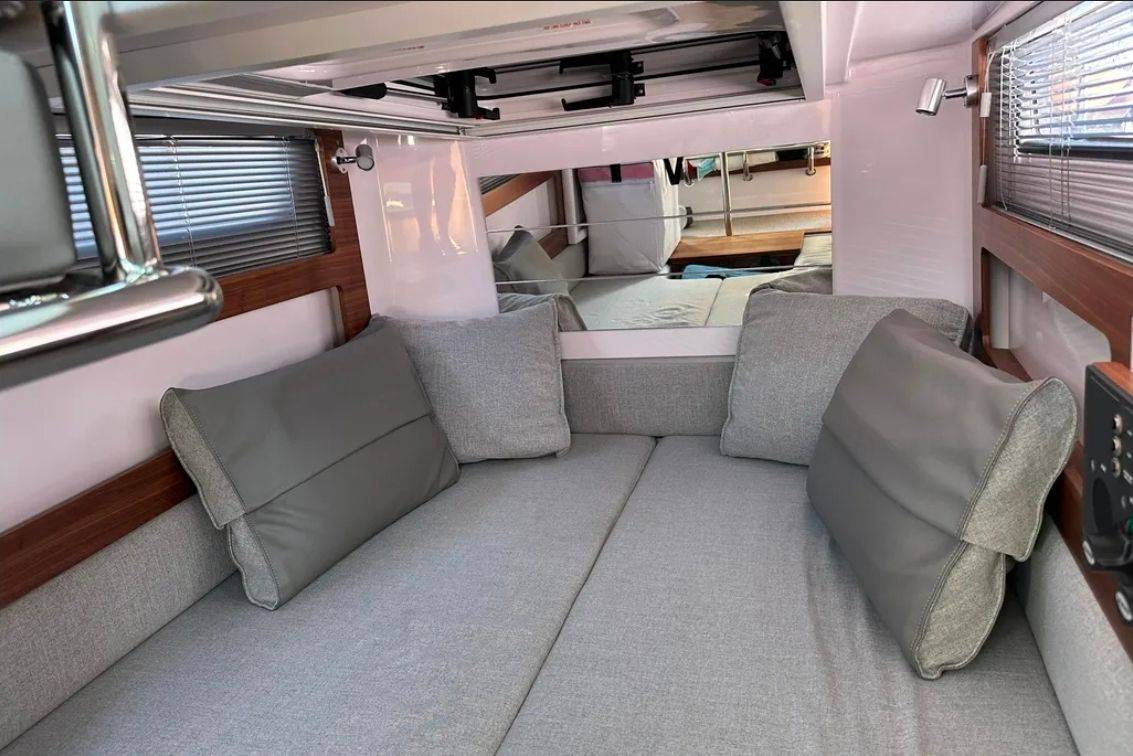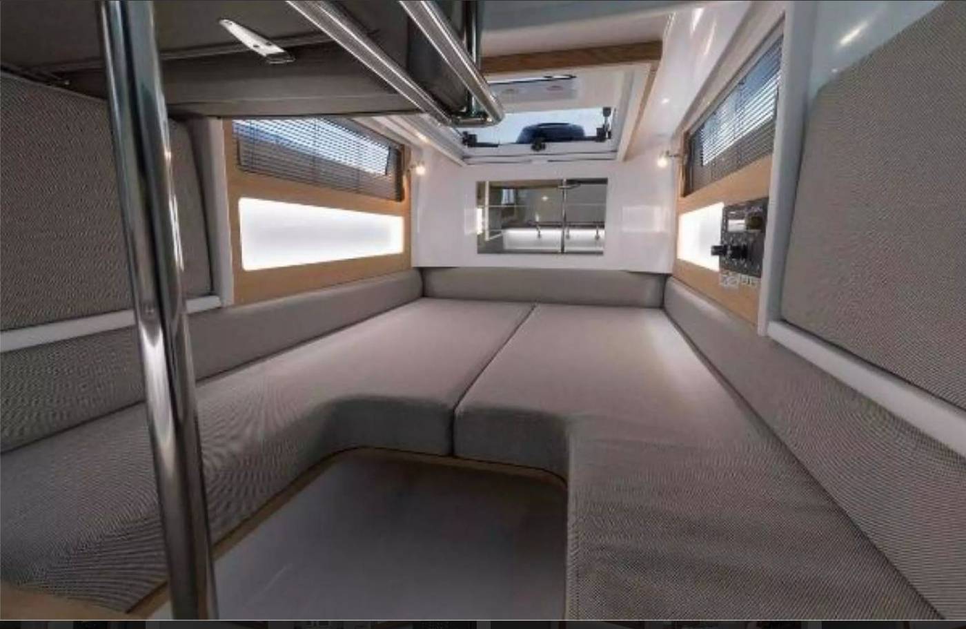 - Walk-around deck with sociable reshaped L-sofa on foredeck and open aft deck area with enlarged storage under deck with integrated locker for windlass/bow thruster battery