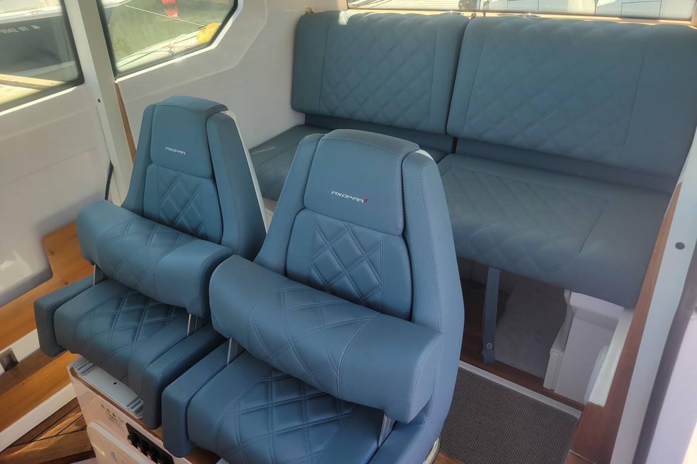 - Sundeck cushions for aft deck and fender box cushions (Silvertex Petrol)