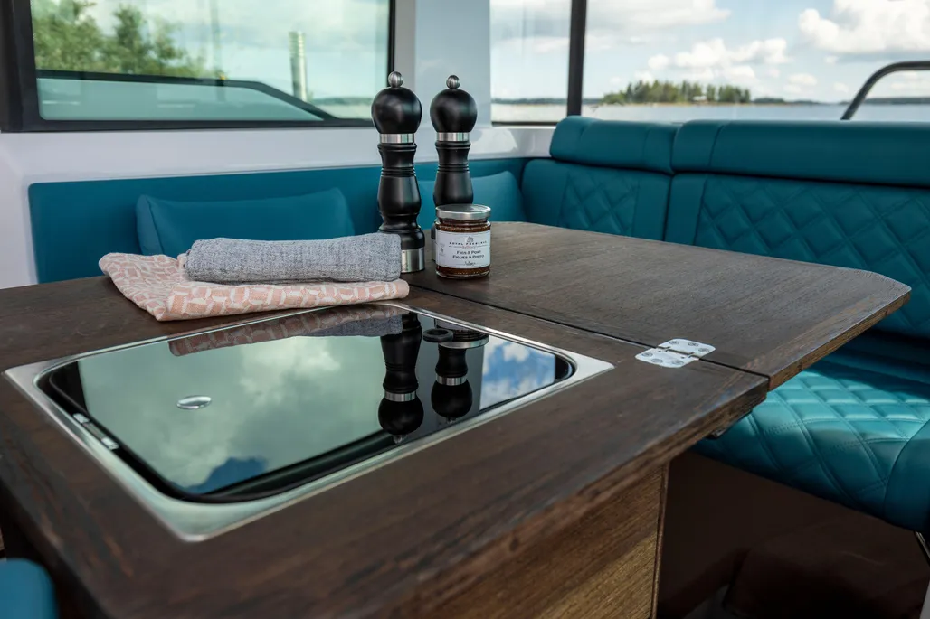 The innovative Gullwing Door concept* opens up the front cabin, the sociable foredeck seating with table* or with the large sun-deck*, in addition with its versatile aft-deck modules ensures our customers get a boat with the equipment they want. The large sliding canvas roof, together with the two large sliding doors, really opens up the cabin to the elements on days when the weather allows.