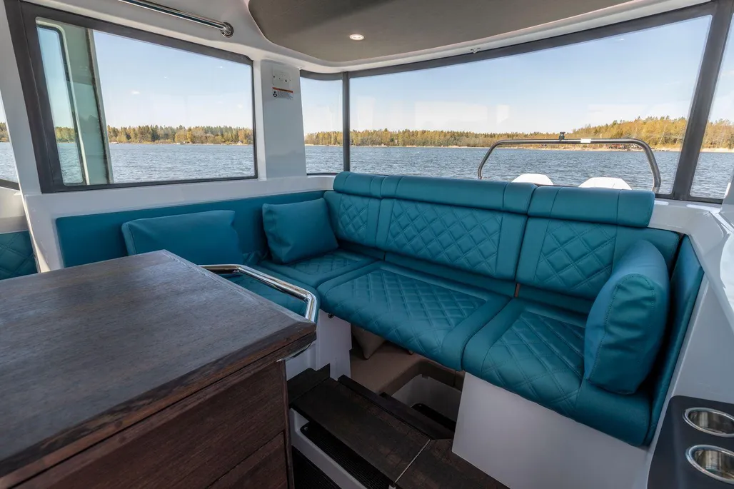 A light, airy and comfortable pilothouse with easy access thanks to wide sliding doors on both sides. A perfect place to socialize and entertain guests is by the L-shaped sofa and table in the rear.