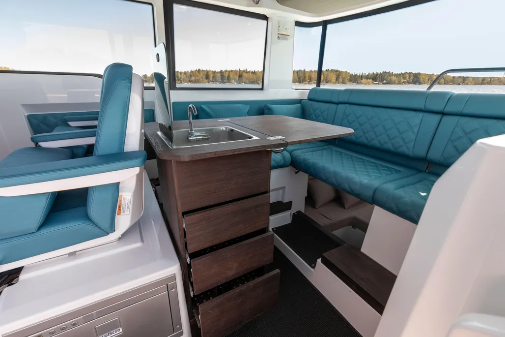 This model combines the functionality, ease of movement, social outdoor and indoor spaces and versatility of outboard walkaround center-consoles with a spacious, fully enclosed weather proofed cabin, that with distinctive looks challenges traditional perceptions of cabin boats.