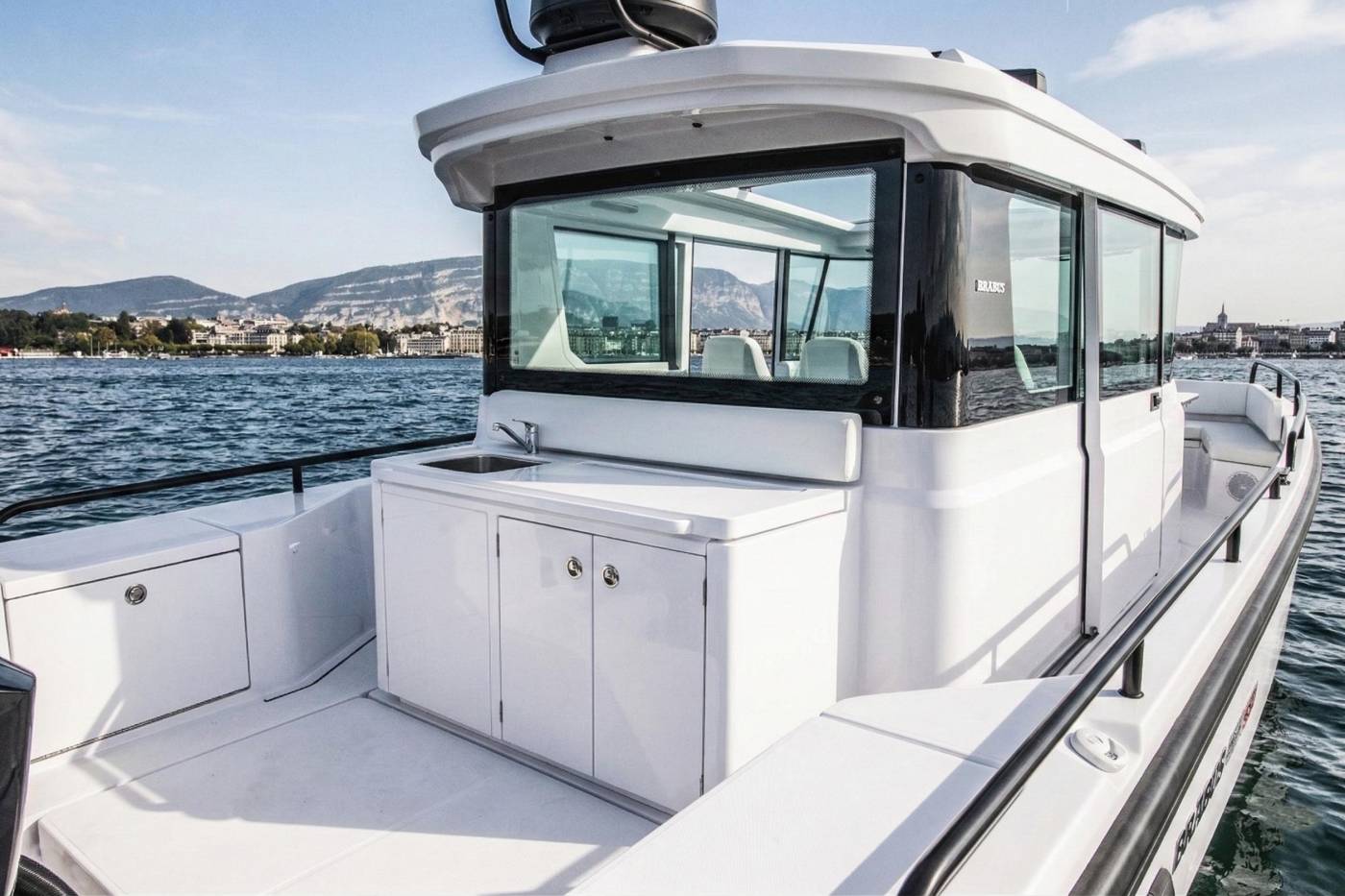 With its gorgeous looks, cutting-edge technology and mesmerizing performance, this 28-foot BRABUS Shadow 500 Cabin Wet Bar provides just the right ingredients for your tailor-made, high-octane marine adventure. Reveal your personality to the world by imparting your own taste and charisma in this stunning and exceptionally fast 50+knots coast-to-coast commuter and adventurous shadowboat for a guaranteed wow-effect.