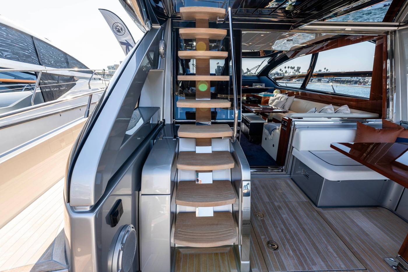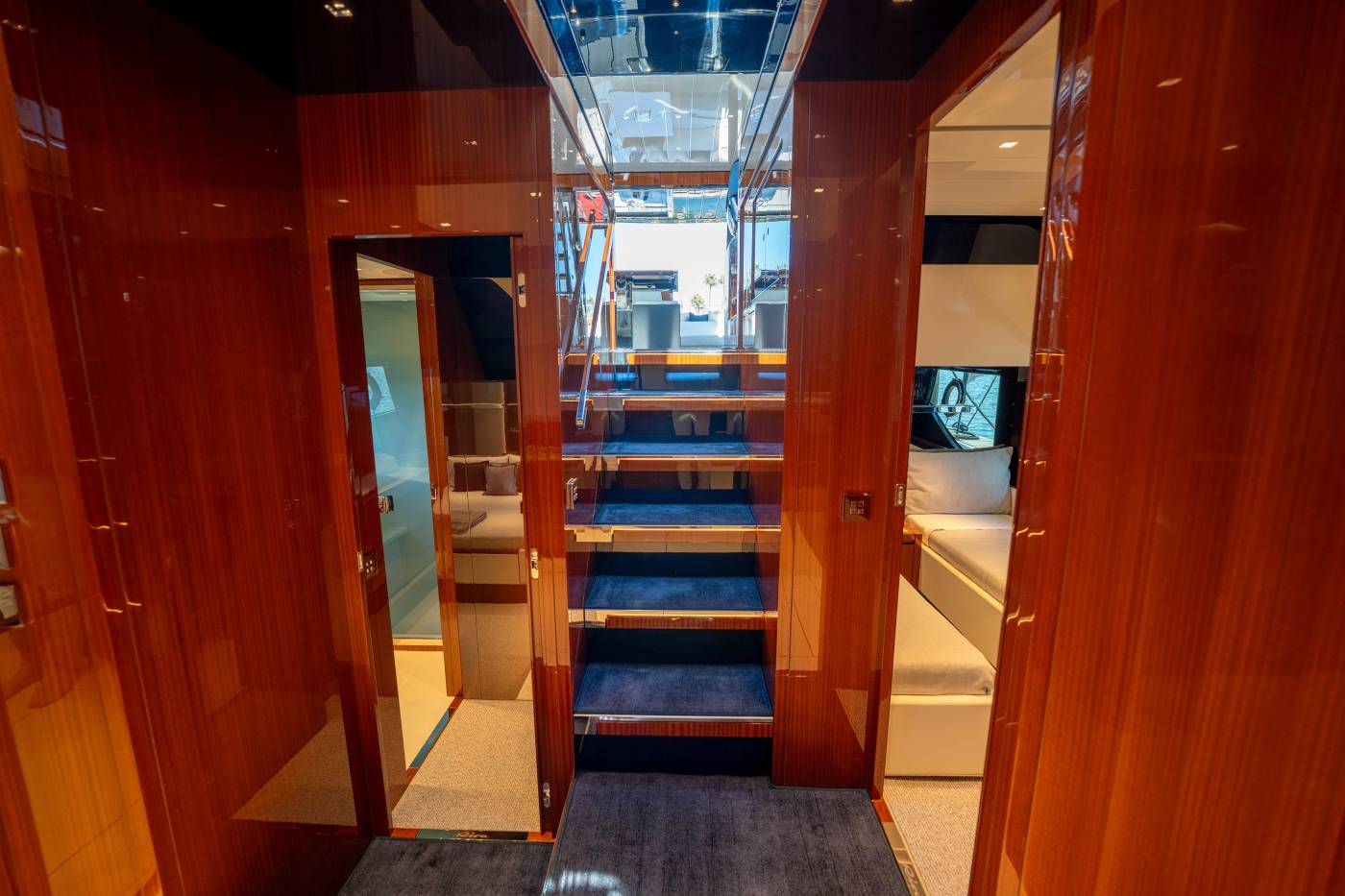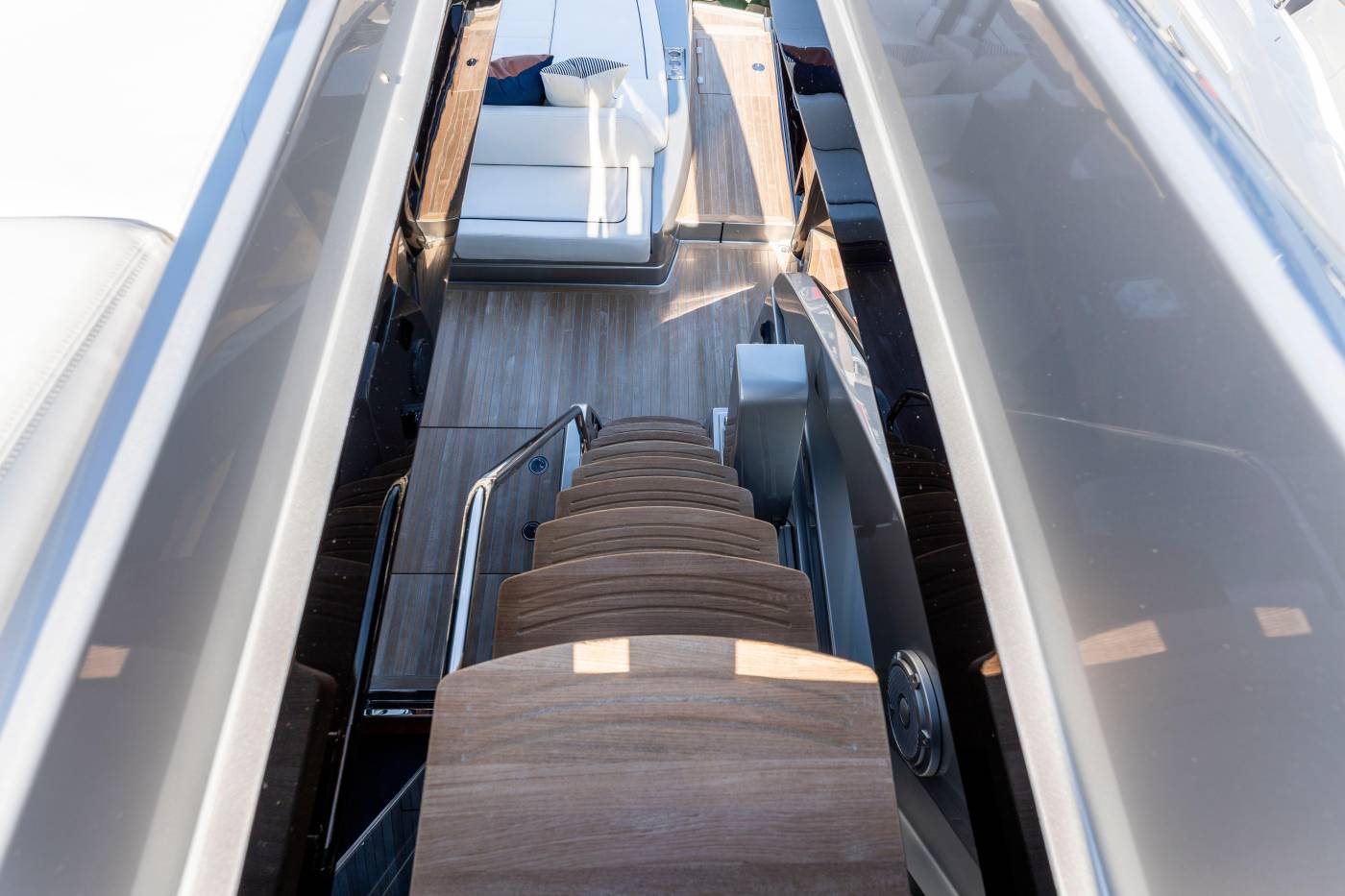 - Access stair to the flybridge in fiberglass and polished stainless steel with teak steps