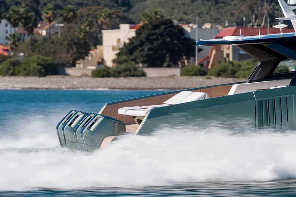 This model marks a milestone as the first Wally yacht equipped with the advanced 600hp Mercury V12 Verado engines—arranged in an impressive configuration of four. Delivering a combined 2,400 hp, the robust and efficient deep V-hull propels the boat to an exhilarating top speed of 50 knots. Despite this remarkable performance, fuel consumption remains efficient, and an expanded fuel capacity allows for a cruising range of up to 300 nautical miles.