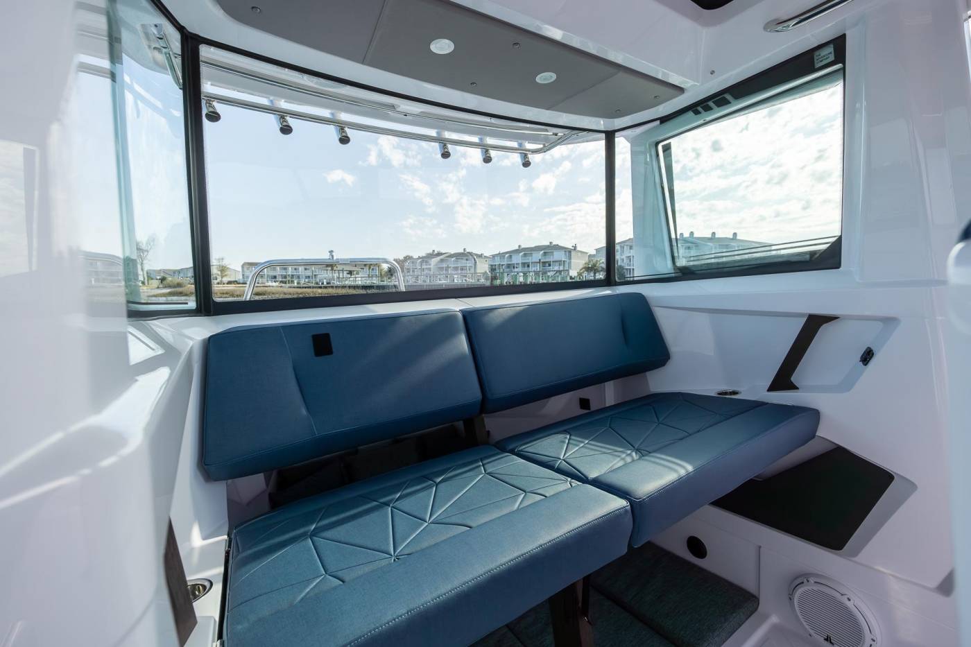 Major features of this offering include: Multi-cabin upgrade package with Sandstone upholstery, U-shaped bow sofa, and JL Audio premium audio system.