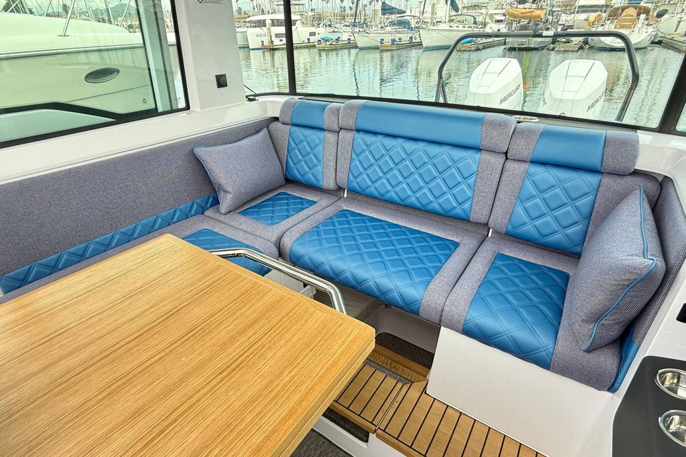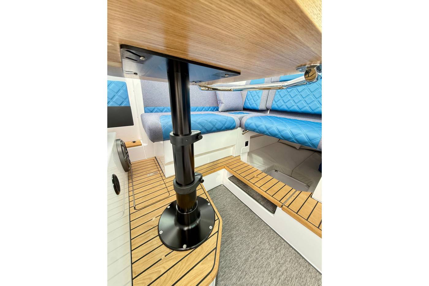 The cabin’s well-configured seating, with a high/low table that can be converted into an additional sleeping arrangement, make for a very comfortable indoor social area.