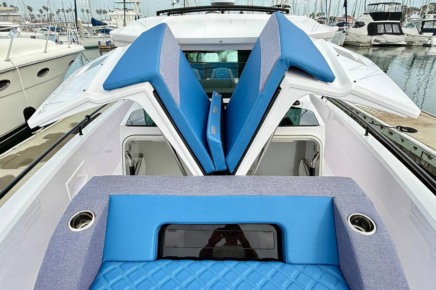 The innovative Gull-wing doors opens up the front cabin, the bow seating with the large sun-pad make for a sociable hangout.