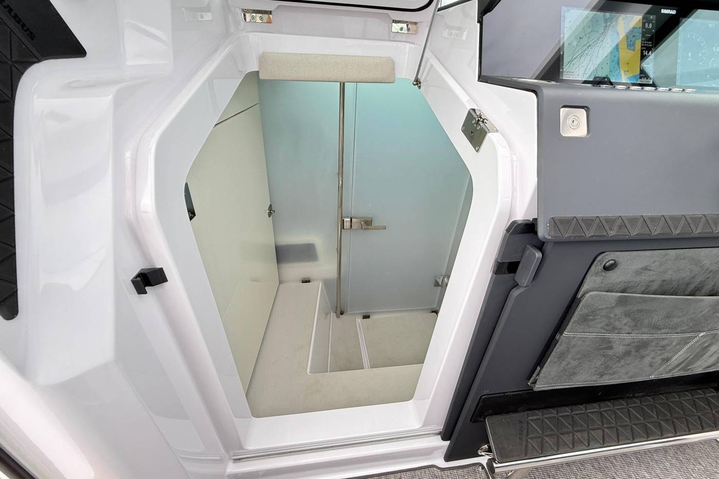 At the helm are two comfortable captain's seats, intuitive controls and glass helm supporting dual Simrad 12” touch displays.