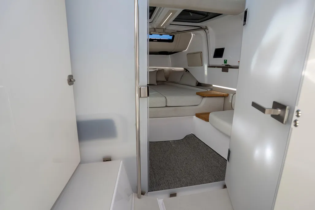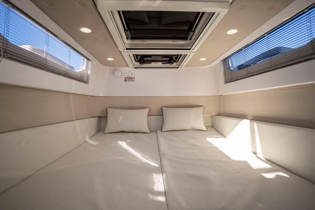 By sliding the sofa's mid-section upwards, you gain seamless access to the expansive aft cabin, which offers comfortable sleeping accommodations for two.