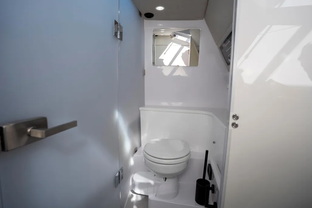 A fully enclosed toilet compartment features a standard toilet bowl, relocated to the starboard side and mounted transversely. It includes a Corian countertop with a sink, faucet, and a small storage compartment. The space can be further upgraded with an optional shower compartment.