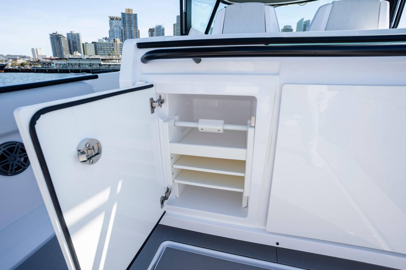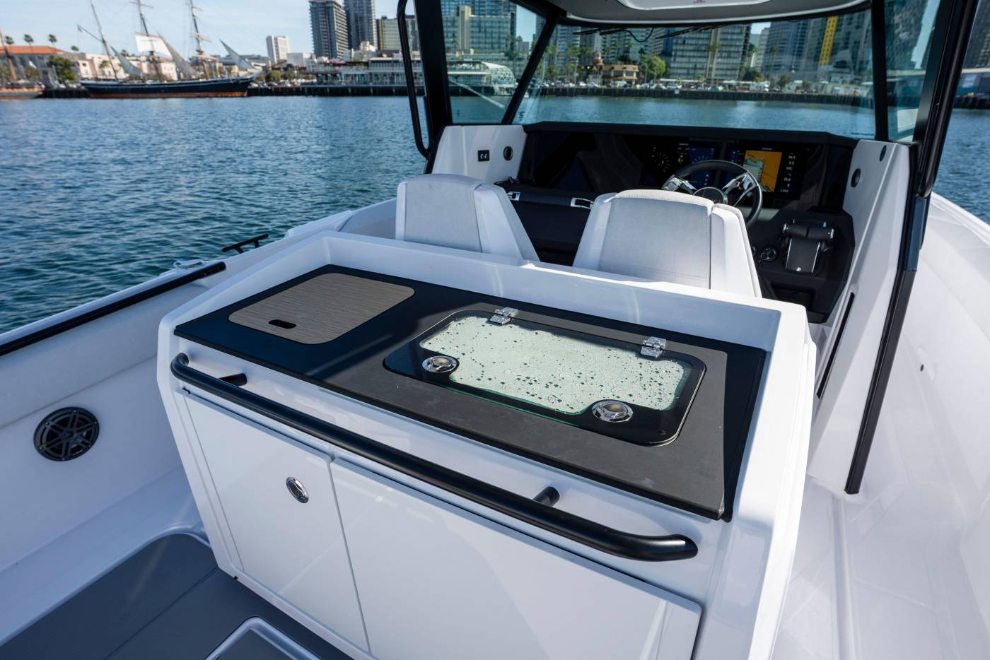 JL Audio Premium Sound System: Exclusively available for the 29 CCX, an upgraded JL Audio Premium Sound system delivers an enhanced onboard audio experience with exceptional sound quality. The system features eight 6.5” speakers providing 480 W of output, driven by an 800 W 8-channel amplifier. Two tweeters positioned at the helm and a 10” 250 W subwoofer further enrich the soundscape, ensuring a more powerful and immersive music experience on the water.