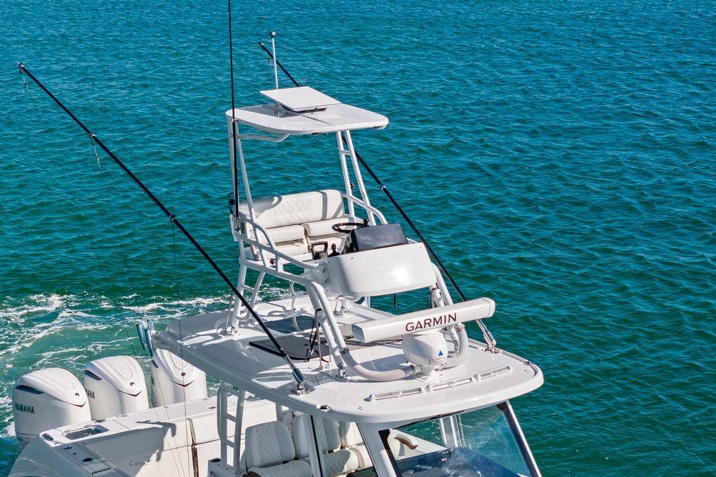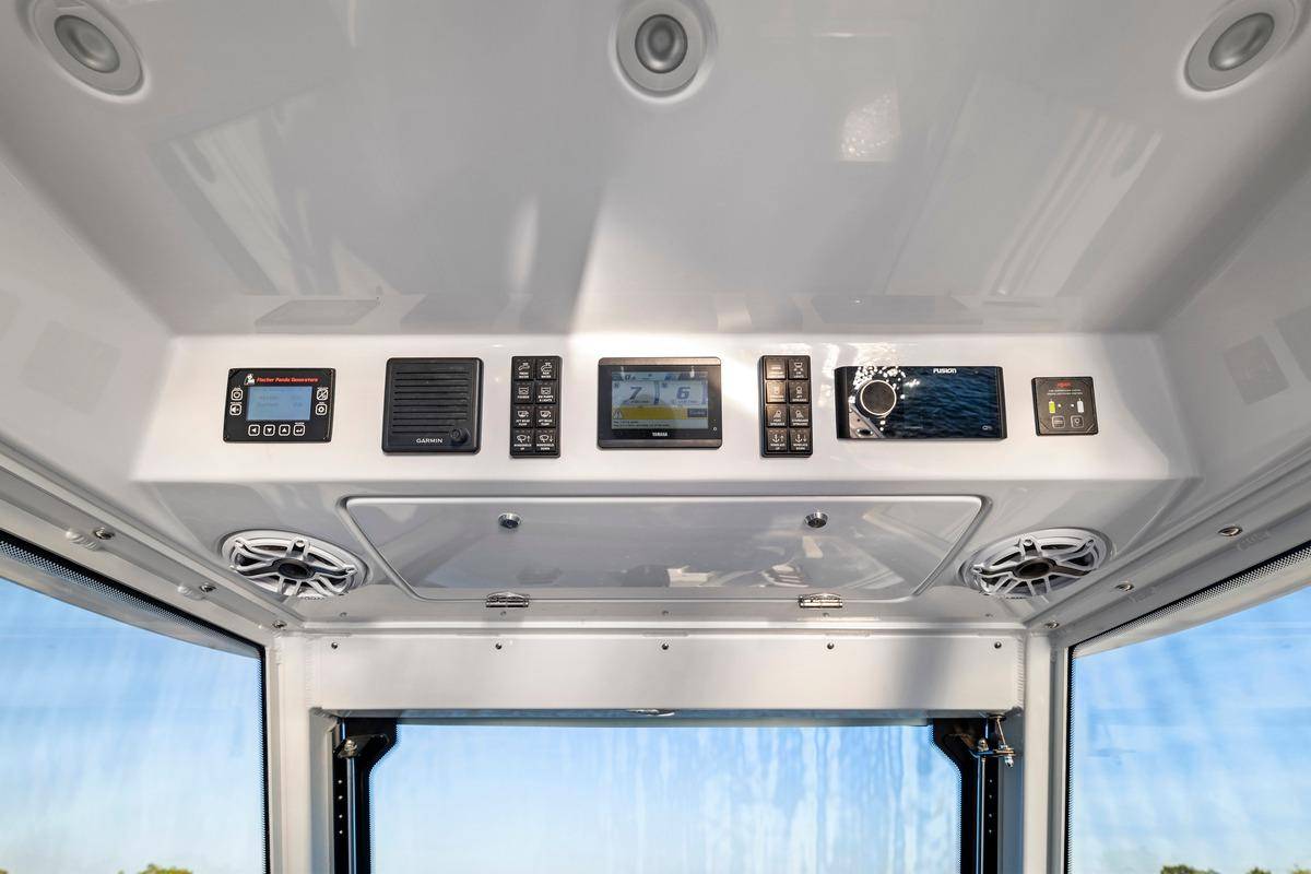 - Fiberglass hardtop with molded-in handrail & drainage trough, aluminum powder-coated frame with hand holds, overhead LED lights (7), spreader lights (4), electronics access hatch, hardtop access hatch, rod holders (8)