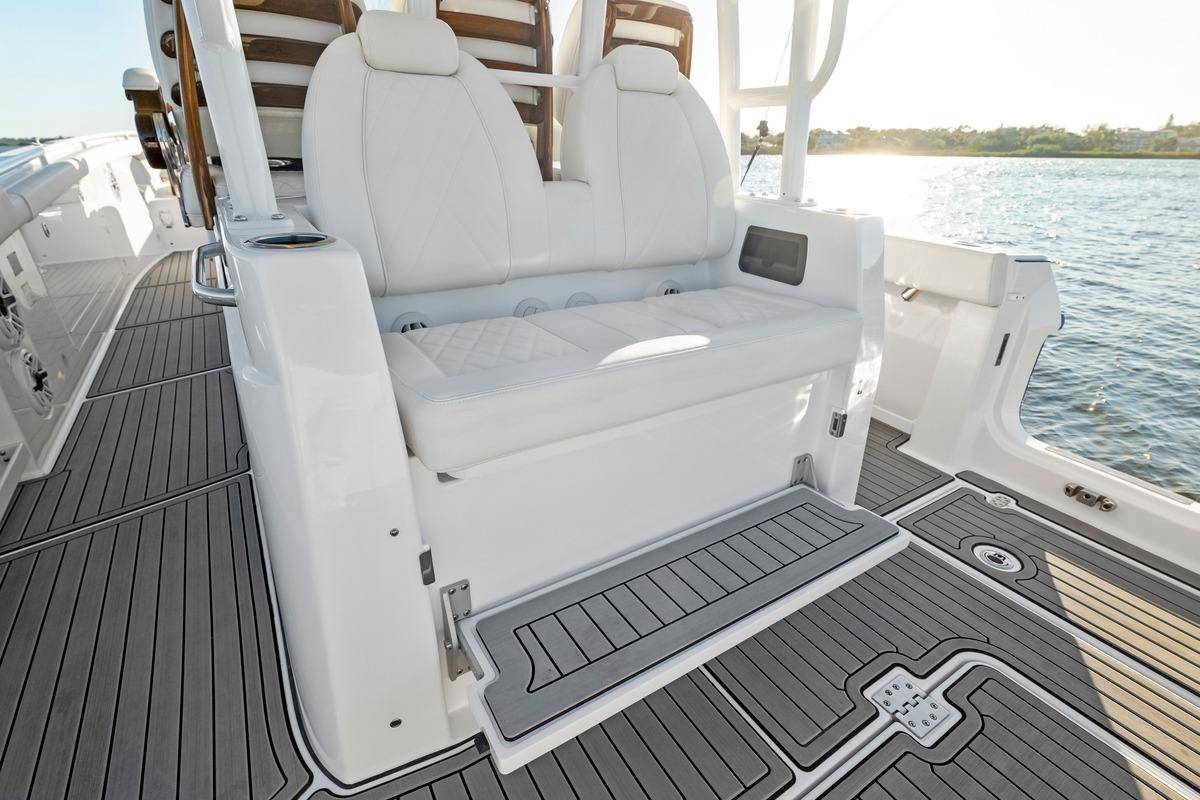 - Aft facing mezzanine seating with handrails (2), cup holders (2), insulated storage tub, tackle storage bins (2), and wireless phone chargers (2)