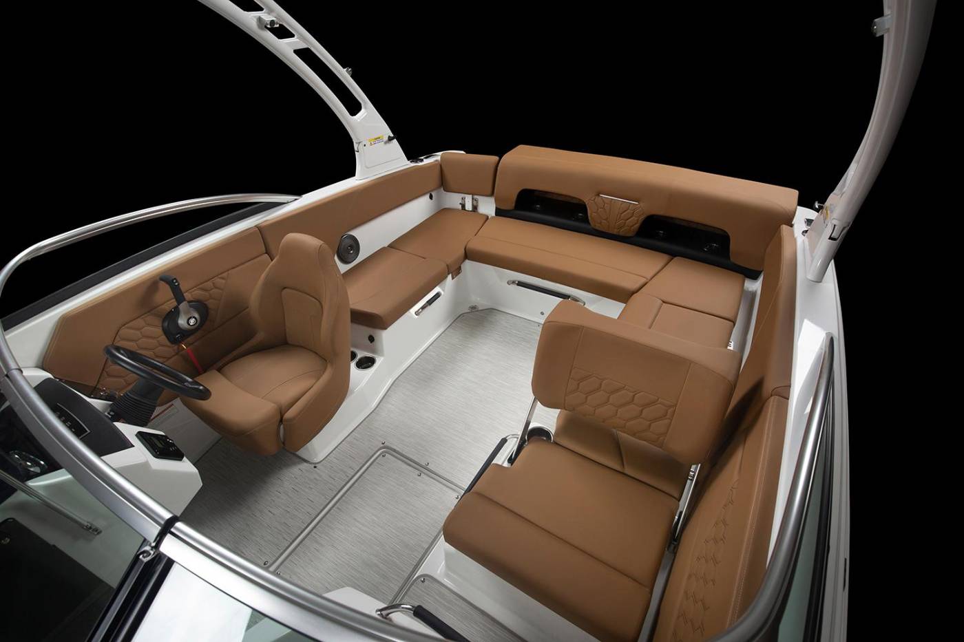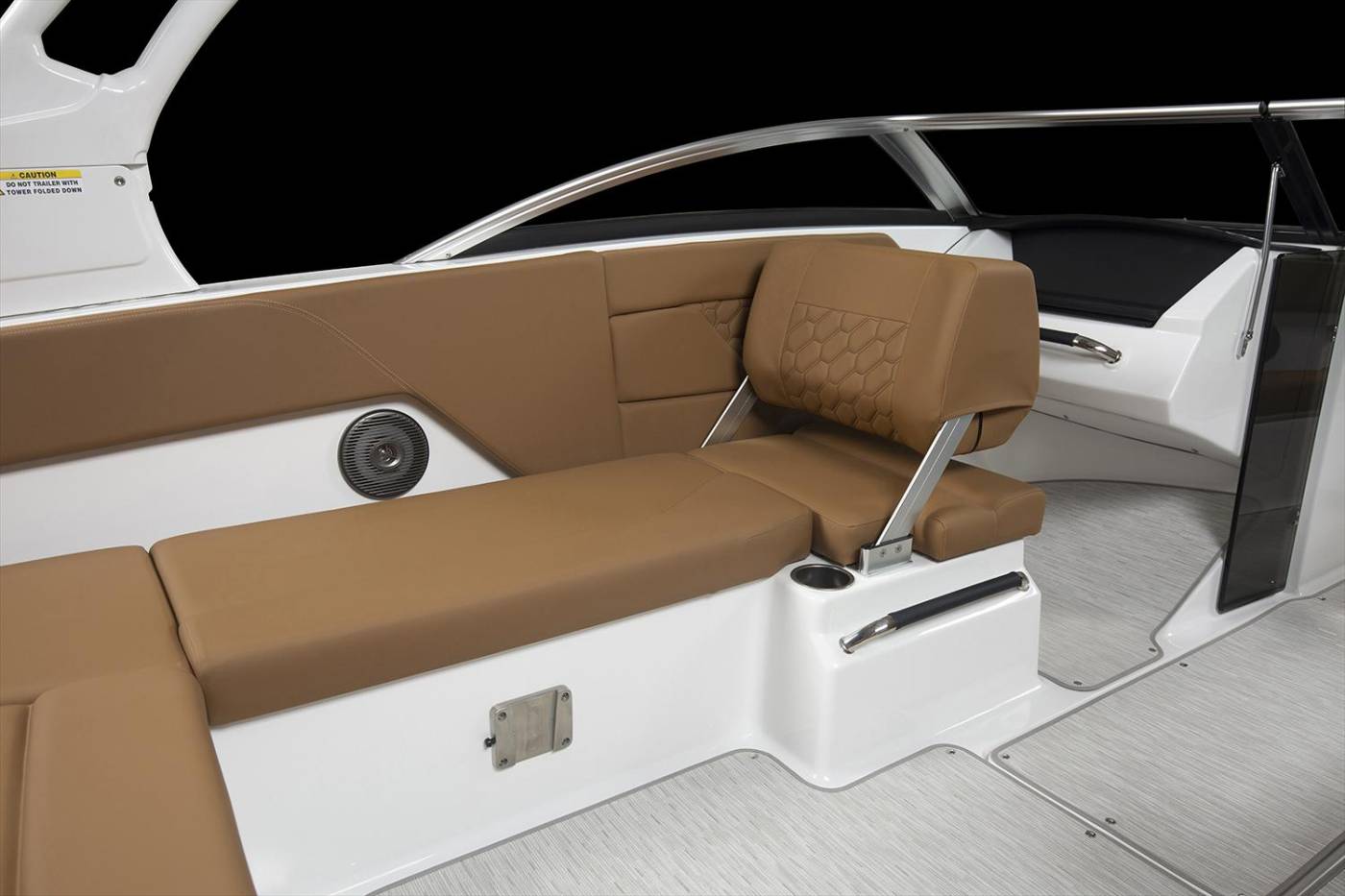 The H1 Outboard redefines the 20-foot bowrider class with a seamless balance of modern design, innovative features, and refined craftsmanship. As the most compact model in the H-Series, it carries a striking presence with its sleek vertical bow stem and distinctive cross-curve windshield, delivering timeless style in a streamlined form. Every detail is elevated—from premium finishes and stainless steel cupholders to quilted stitching and advanced Cool Touch technology—creating a comfortable, upscale environment built for long days on the water. The versatile U-shaped cockpit with a flip seat invites connection and relaxation, while smart storage solutions maintain a clean, open layout. Whether entertaining or cruising, the H1 OB offers a sophisticated, carefree boating experience that exceeds expectations.