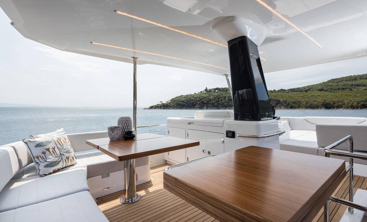 The Sirena 48 is designed with comfort in mind, particularly on the aft deck where thoughtful layout meets versatility. Dual boarding gates to port and starboard open onto a generous swim platform, making guest access effortless. Four layout configurations allow for customization, with options such as crew quarters, additional storage, a folding swim platform seat, or a more open deck arrangement. Adaptable seating, including movable loveseats around a folding table, adds convenience beside the aft galley. With sweeping views, easy water access, and a smooth connection to the saloon, the aft deck is an inviting space for relaxing and entertaining.