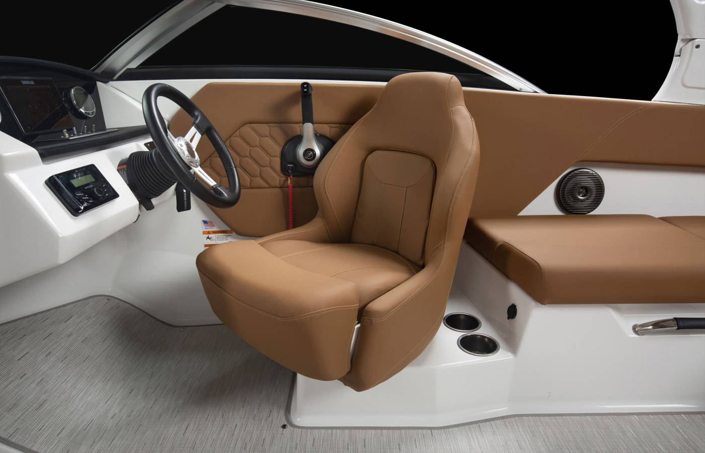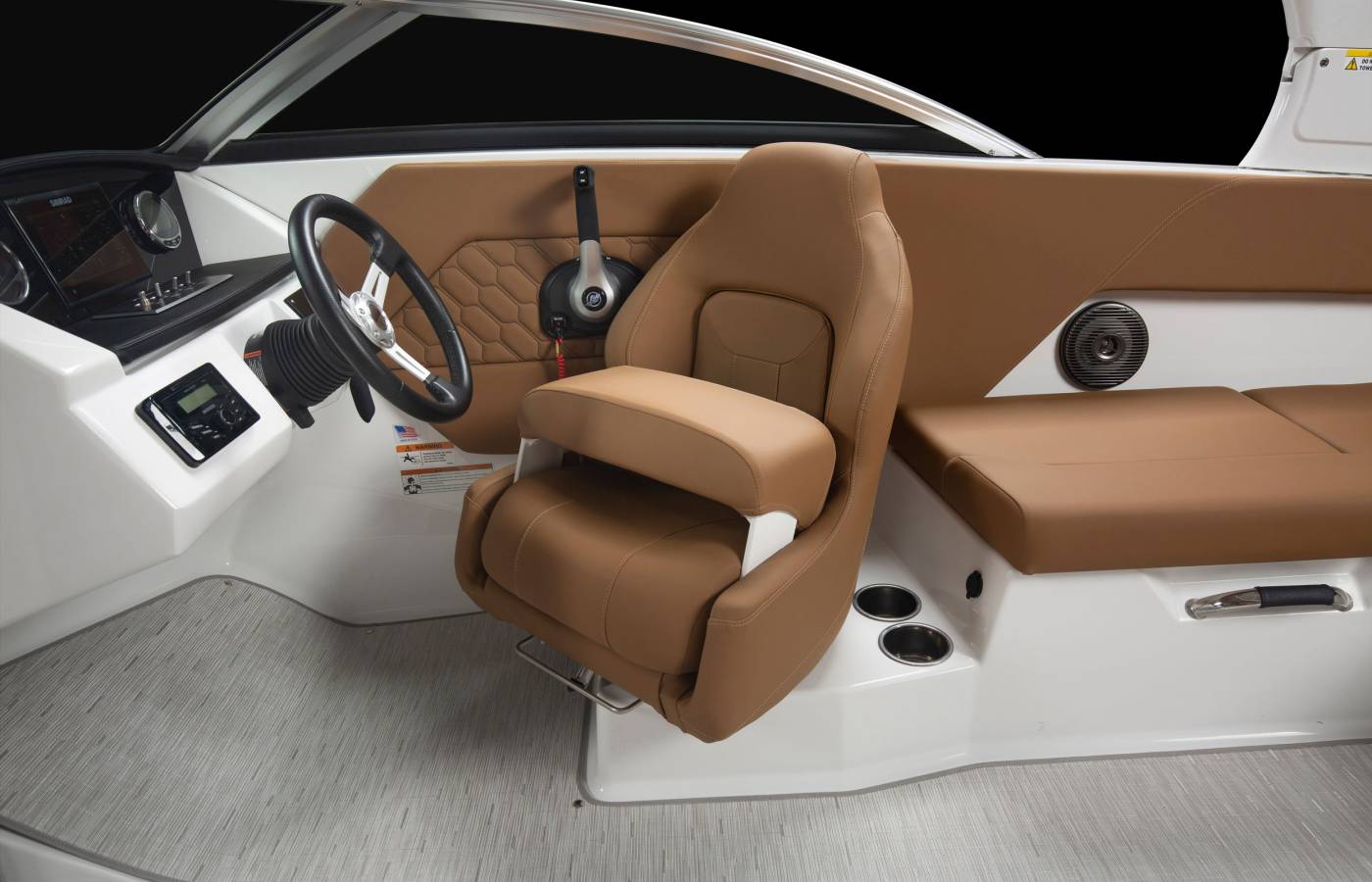 Smart technology and innovative design come together to enhance every moment on the water. At the helm, a modern command center features intuitive touchscreen displays, precision controls, and power steering, providing confident handling at any speed. Innovation extends into every detail—from integrated digital systems to advanced navigation options—ensuring the driver enjoys effortless control while passengers experience a relaxing day on the water.