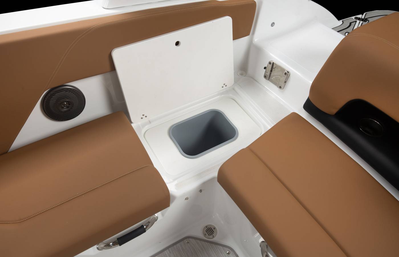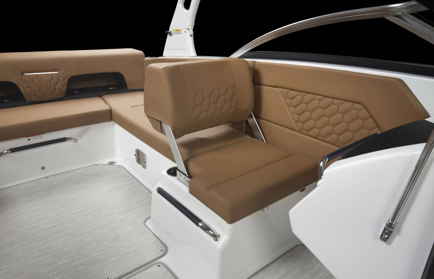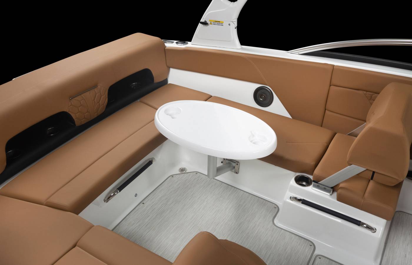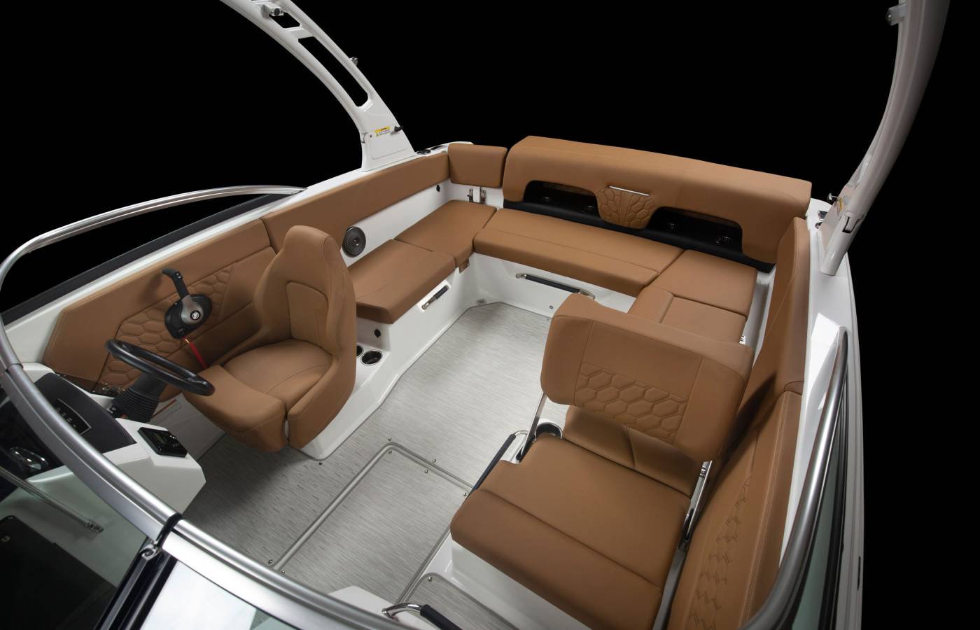 A versatile U-shaped cockpit with a flip seat creates a spacious, inviting layout for socializing and relaxation. Innovative storage solutions keep essentials within reach without compromising space or enjoyment on the water.
