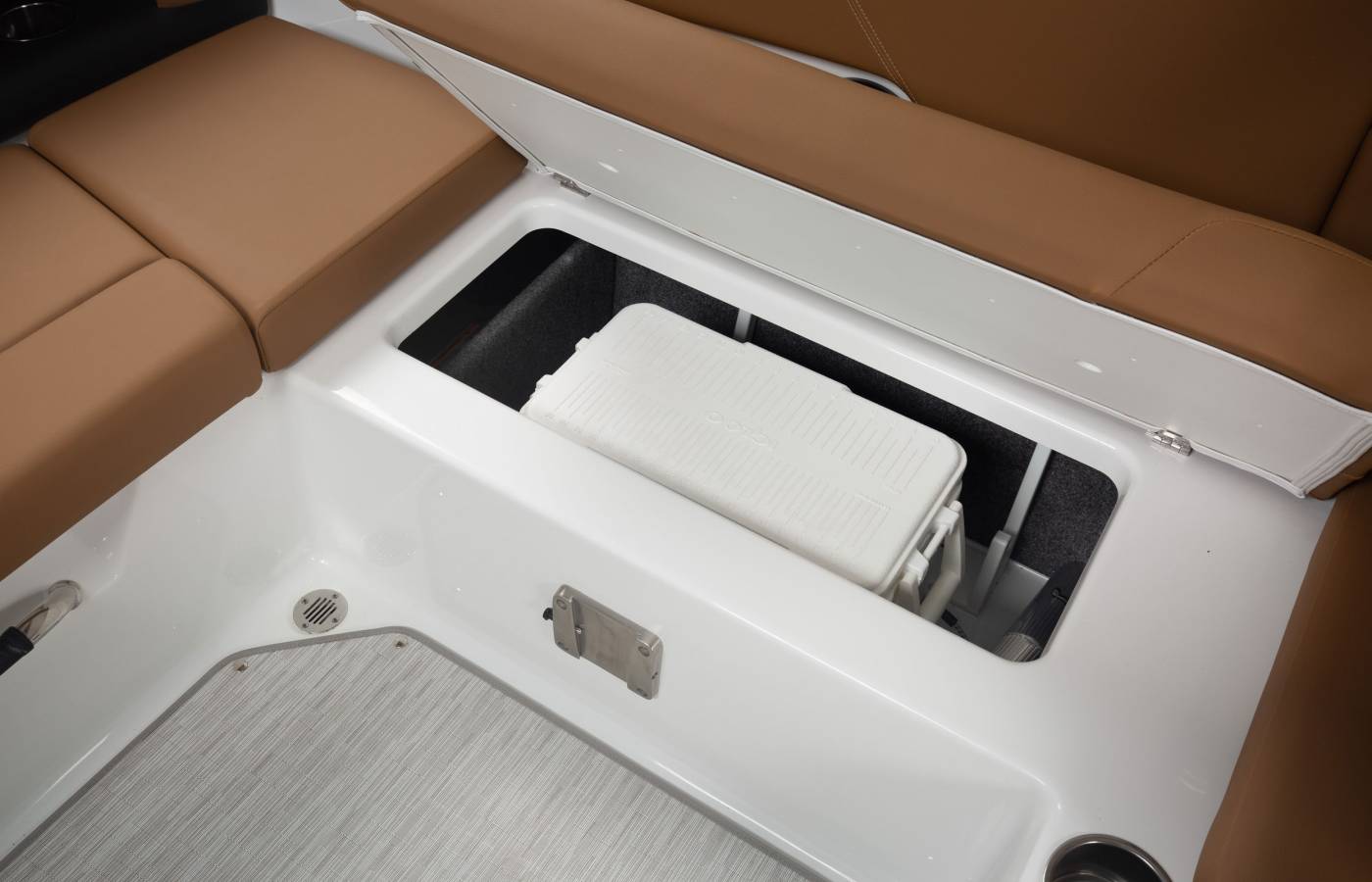 - Storage locker, in-floor, w/ gas-assist hinged lid & mat