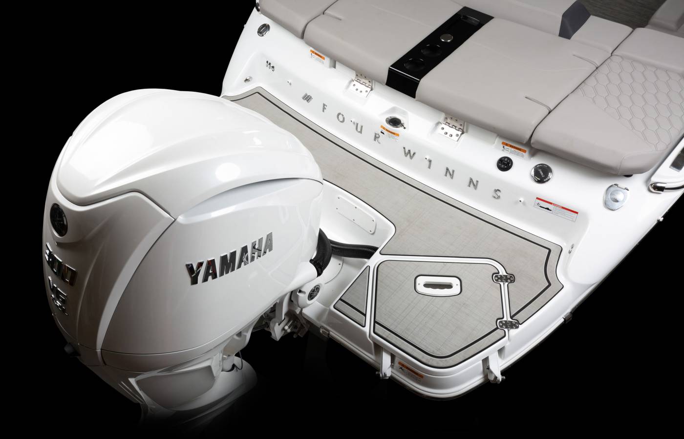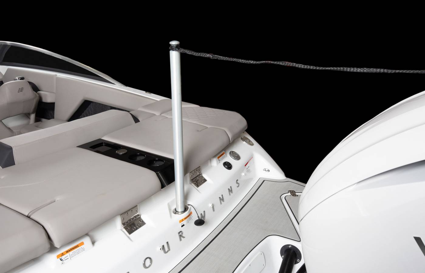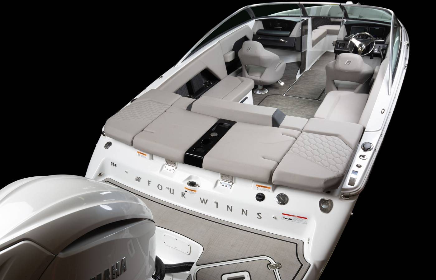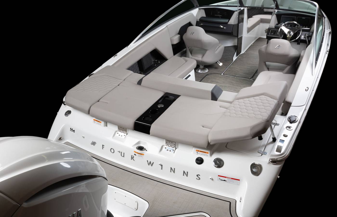Every detail of the H4 is thoughtfully designed to reflect a premium aesthetic. Soft, grippy swim platform mats and woven cockpit flooring add refined finishing touches, while intricate hand-sewn stitching, gleaming metal accents, and plush foam showcase Four Winns’ legacy of superior craftsmanship. Monochromatic color schemes create a fresh, streamlined look, and upscale materials—such as Cool Touch surfaces, vinyl-wrapped handles, durable upholstery, and padded bow walls—combine lasting durability with effortless style and comfort.