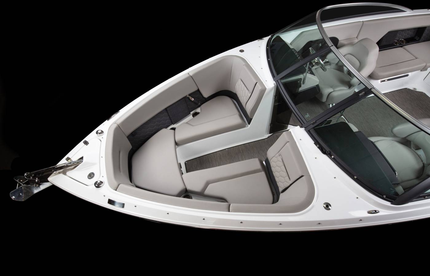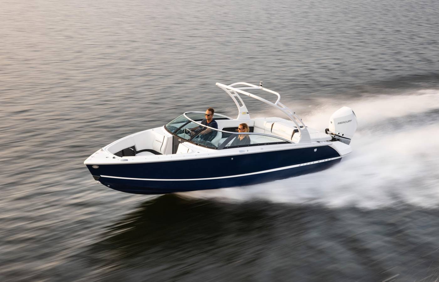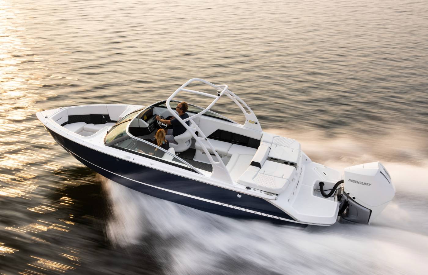 The H-Series is distinguished by its vertical bow stem, while the signature cross-curve windshield is accented with a sleek black pillar and bright header. Elongated side wings enhance its streamlined profile, creating an unmistakable design statement.