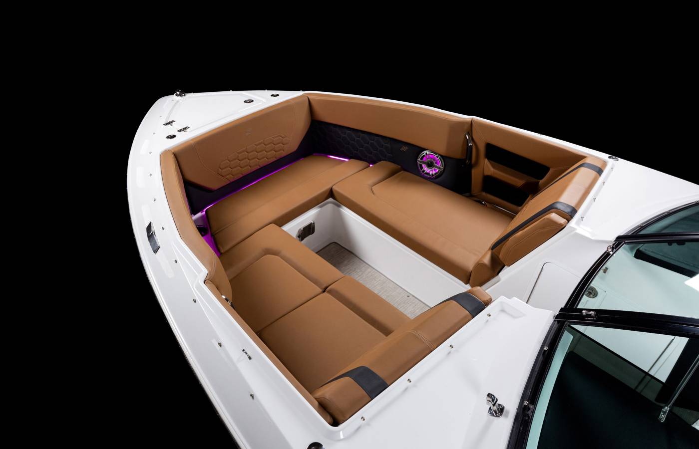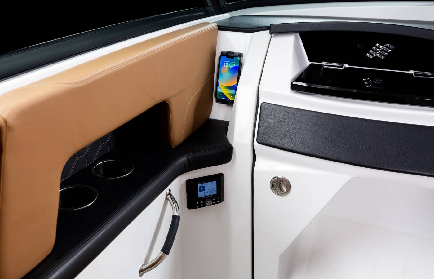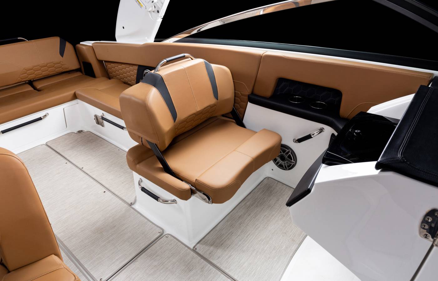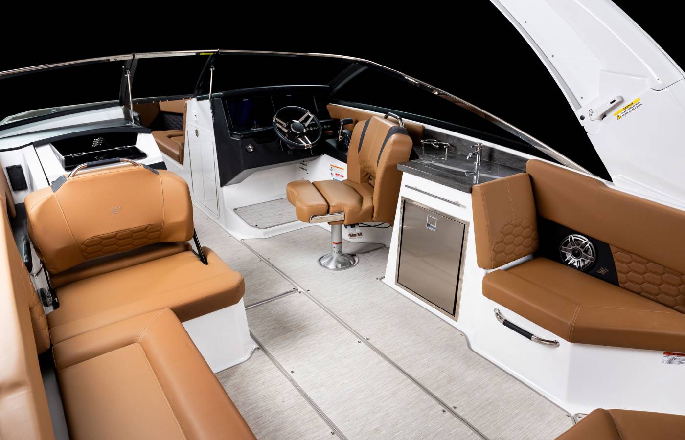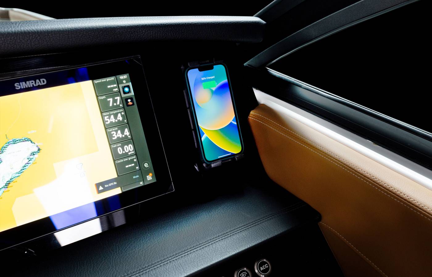 - Instrumentation with twin 12" MFD touchscreens including engine data, active trim control and monitoring, preloaded charts, audio control, and transducer (water, temperature, sonar)