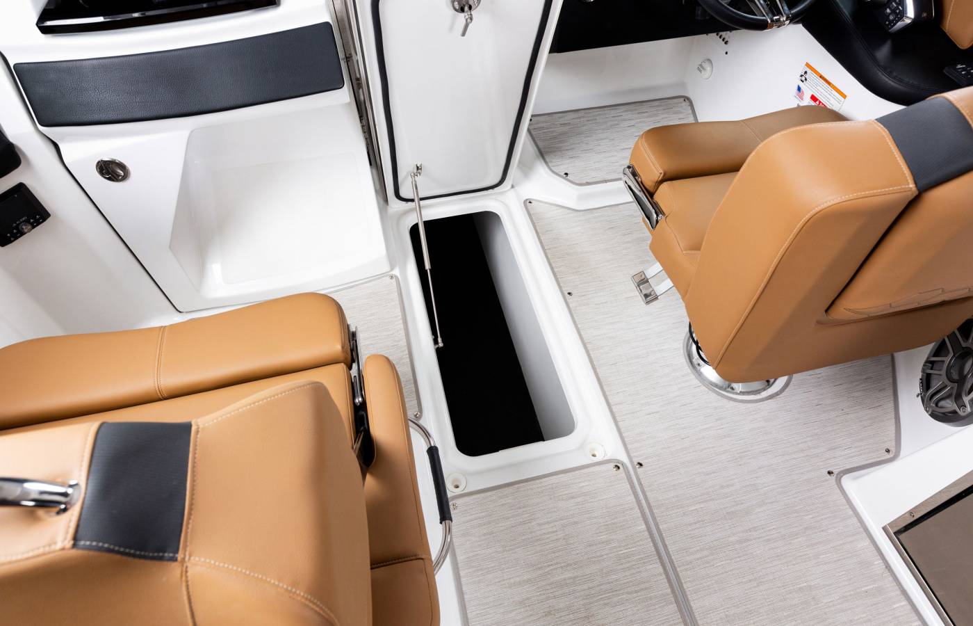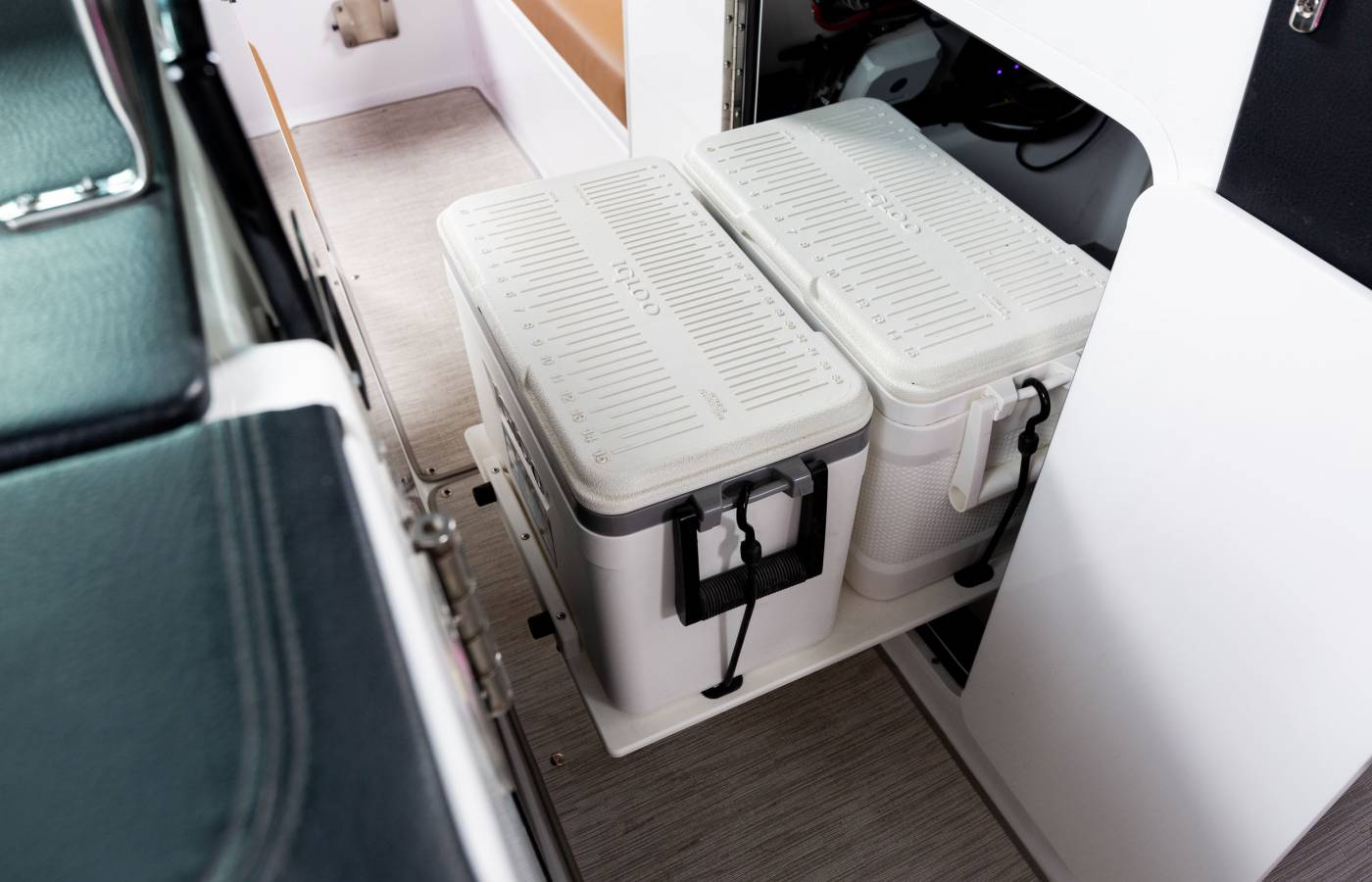 - Floor lockers with hinged FRP lids, gas-assist lift, bow and cockpit, stainless steel lockable latches