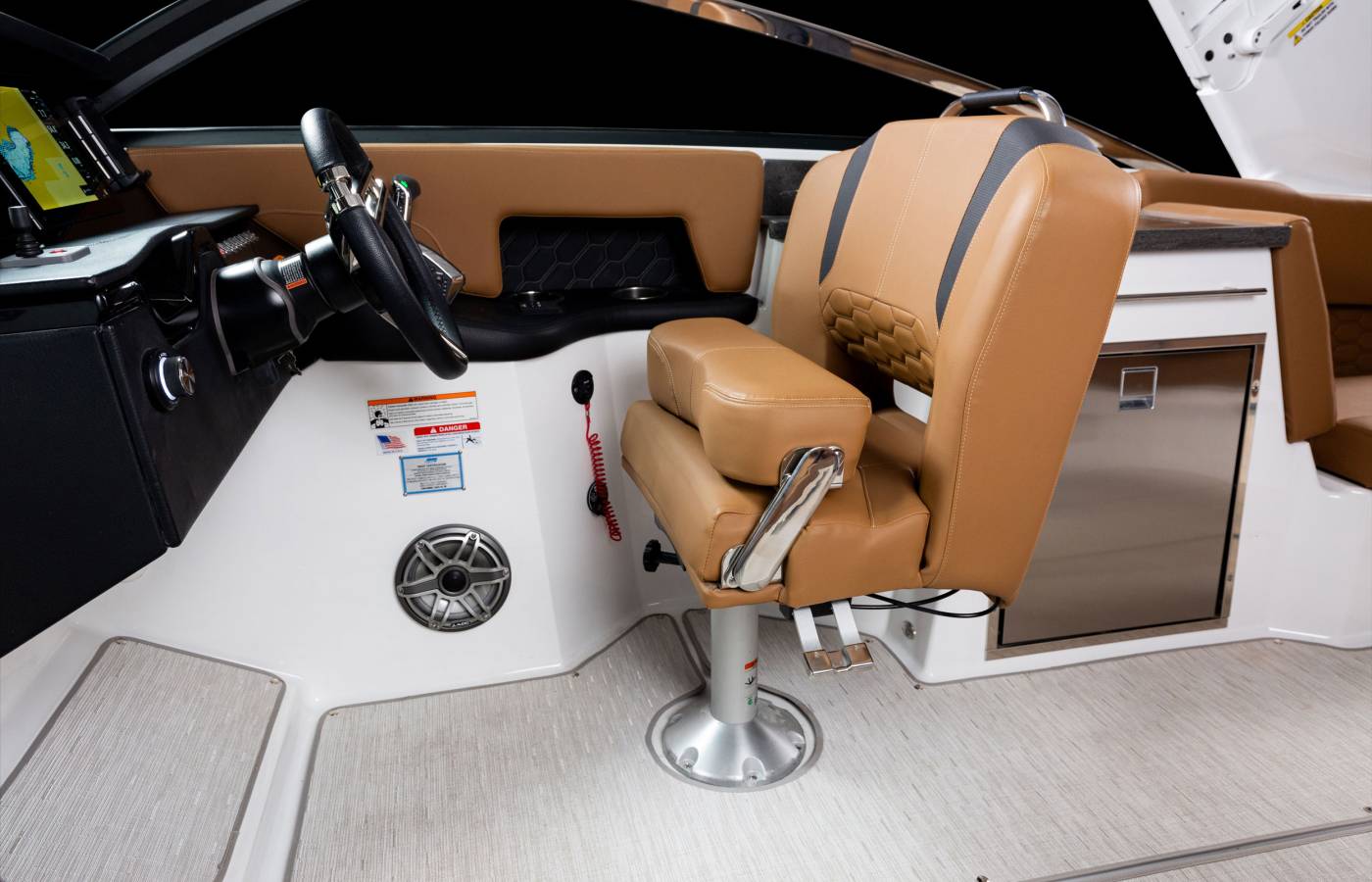 - Helm seat with flip-up bucket bolster, manual swivel, forward and aft adjustment, 4-way power (up and down)