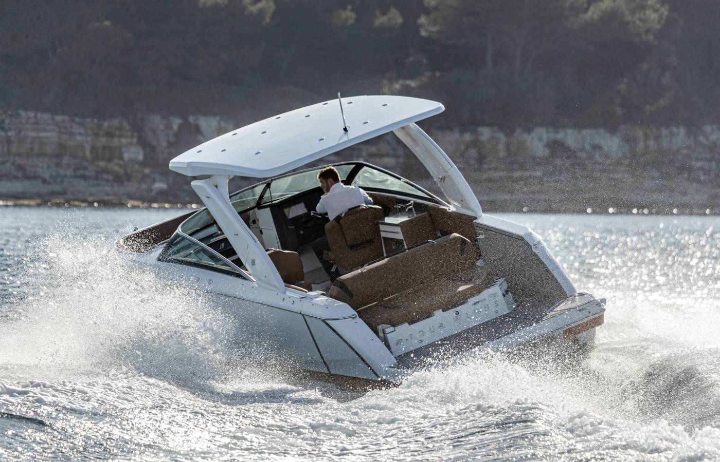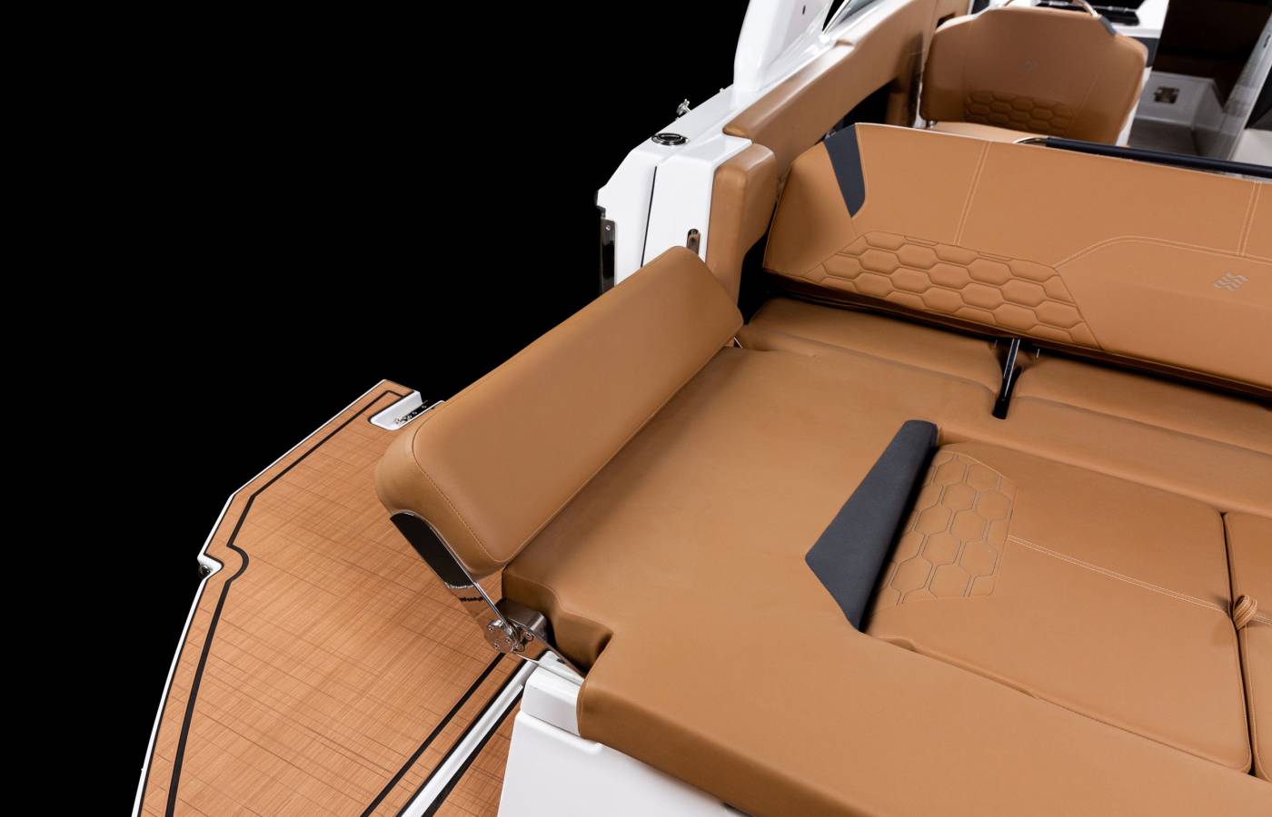 The H9 Sterndrive redefines the bowrider experience under 40’, distinguished by its standard Elegant Side Terraces. At the touch of a button, the terraces extend outward on the same level as the deck, seamlessly expanding the living space and creating the perfect setting for unforgettable moments on the water. Designed with relaxation in mind, the H9 also features a fold-down backrest that effortlessly converts the rear seating into spacious sunbathing areas.