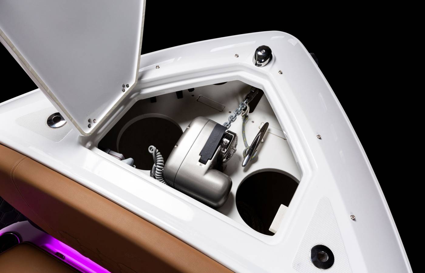 - Anchor locker with fiberglass door (RTM), friction hinges, and stainless steel latch