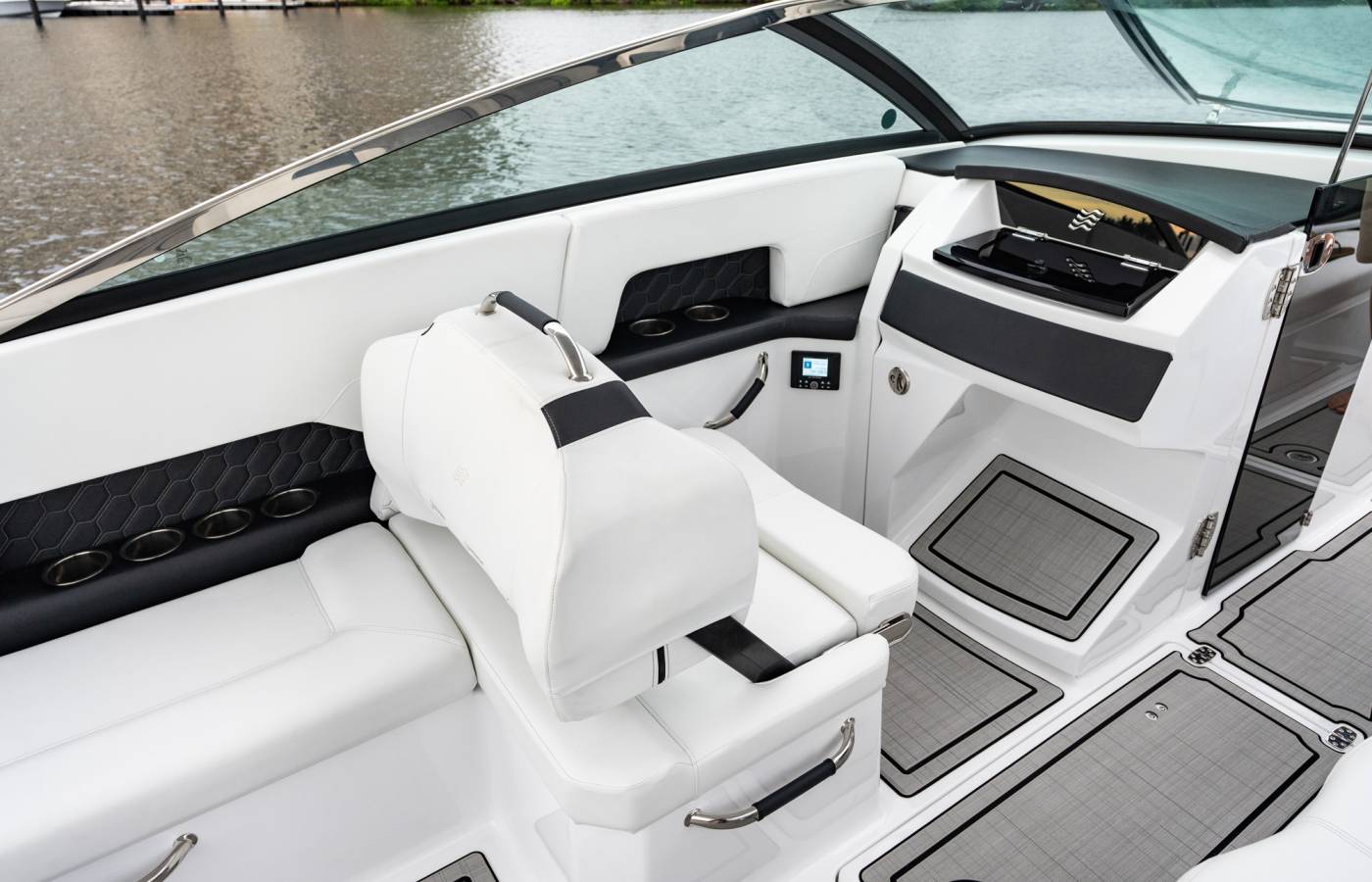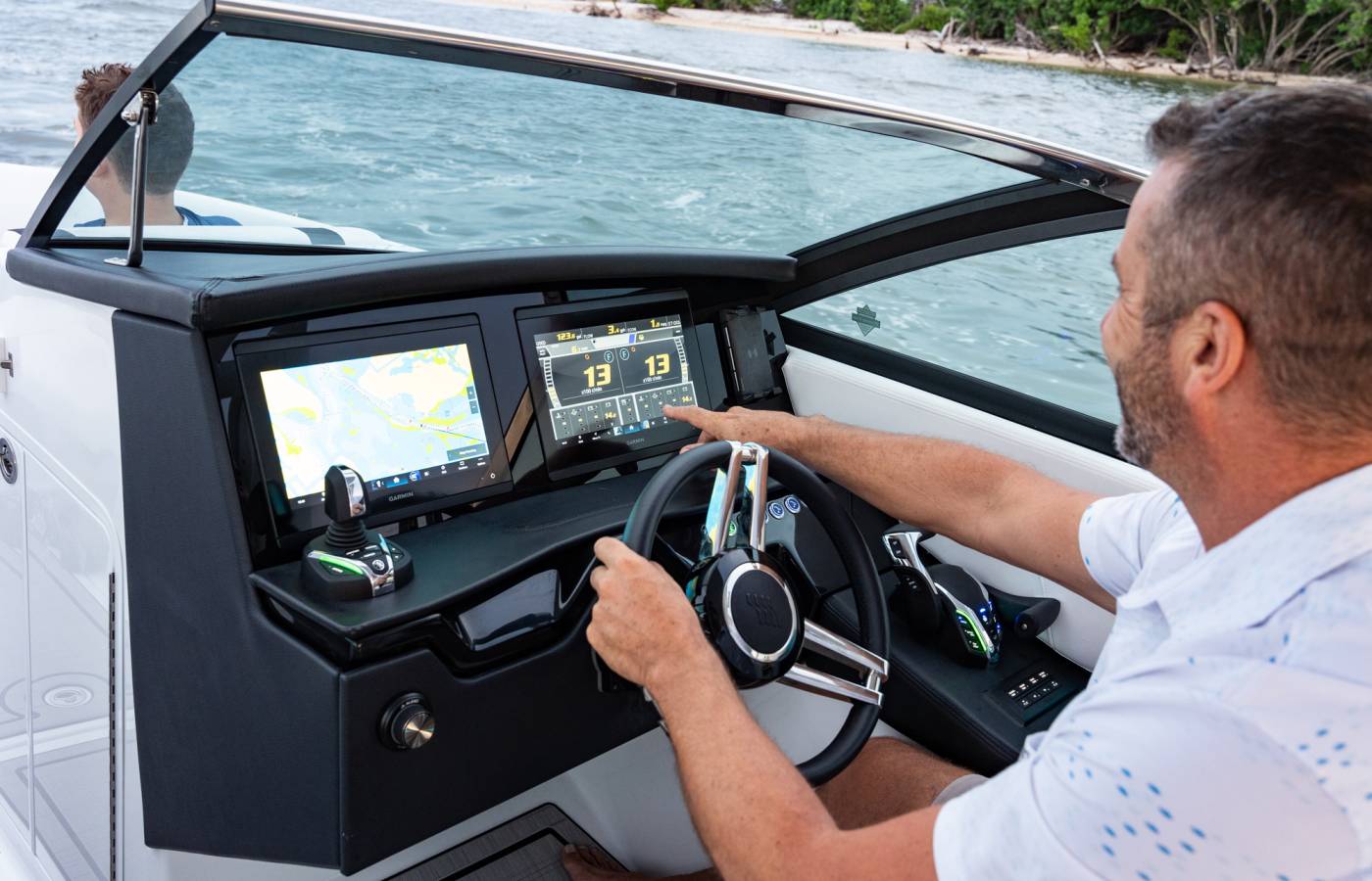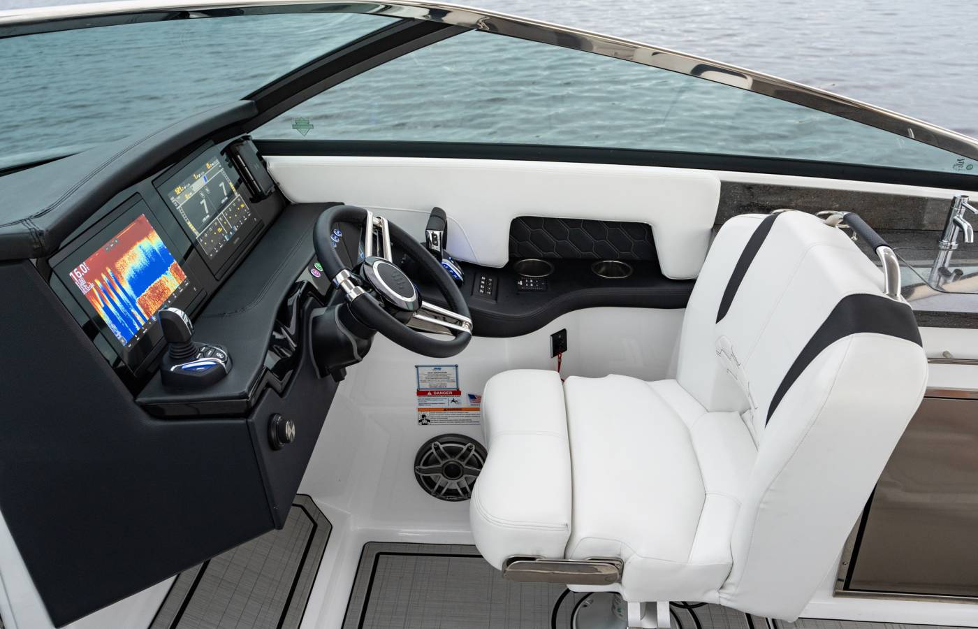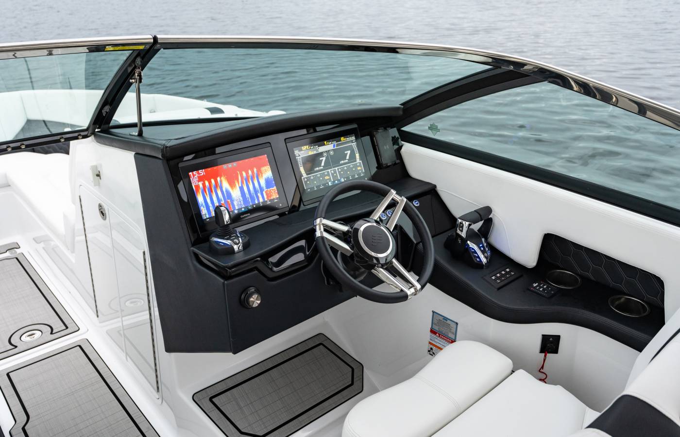 - Instrumentation, helm: twin 12" MFD touchscreen w/engine data, active trim control & monitoring, preloaded charts, audio control, transducer (water, temperature, sonar)