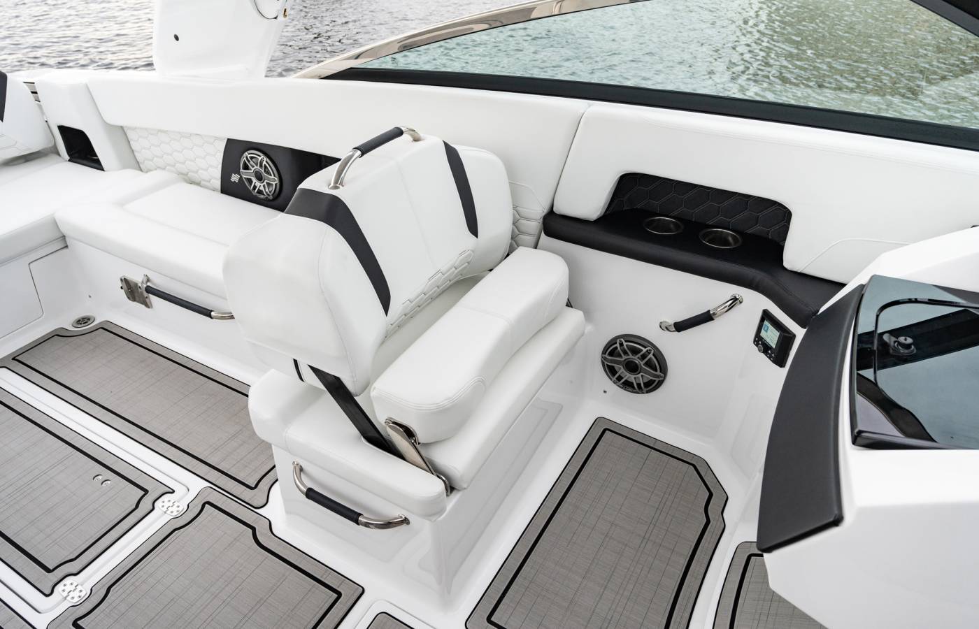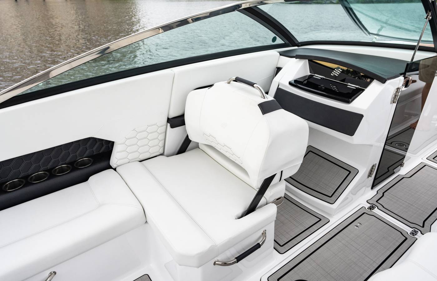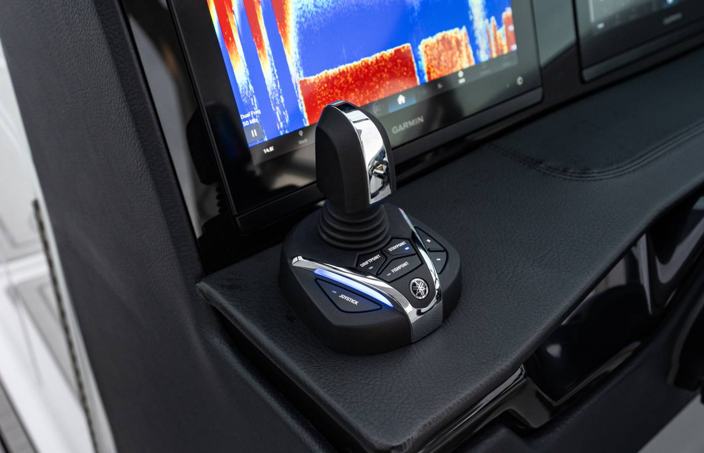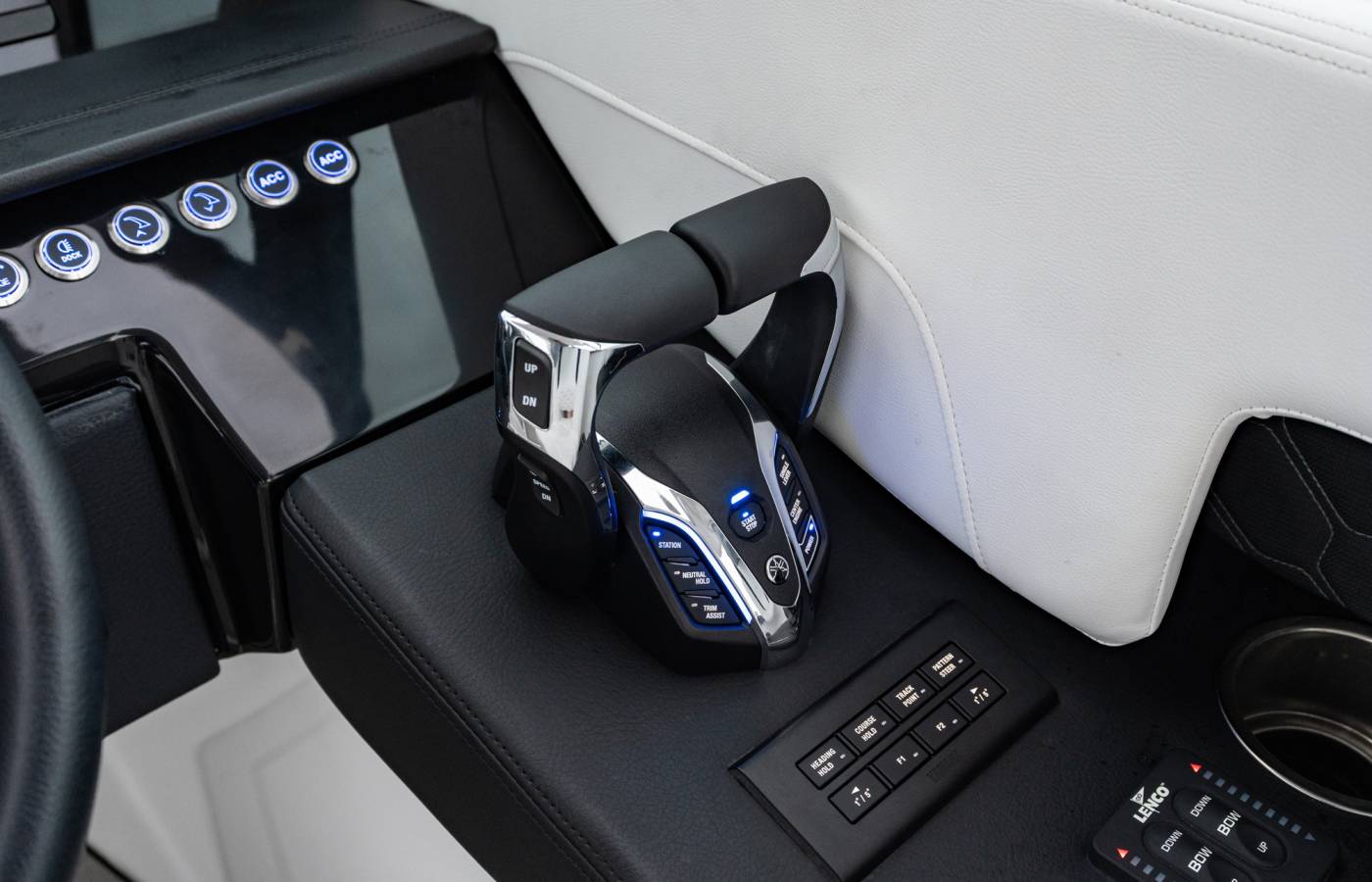 - Instrumentation, helm: twin 12" MFD touchscreen w/engine data, active trim control & monitoring, preloaded charts, audio control, transducer (water, temperature, sonar)