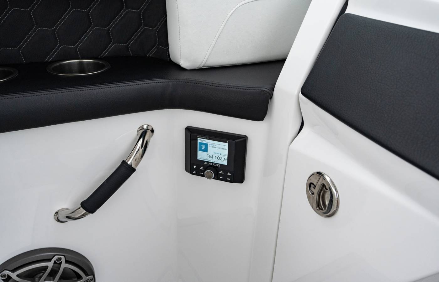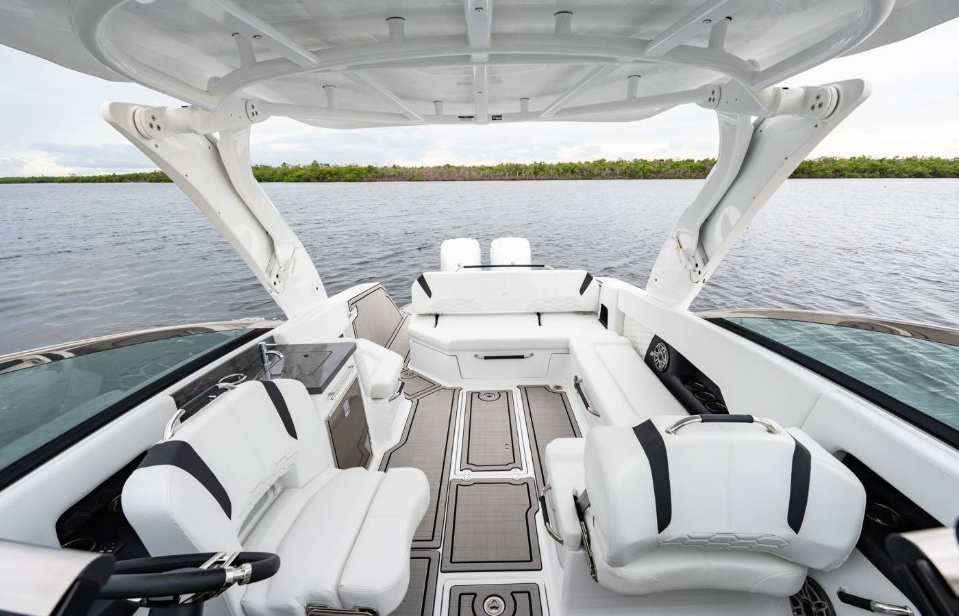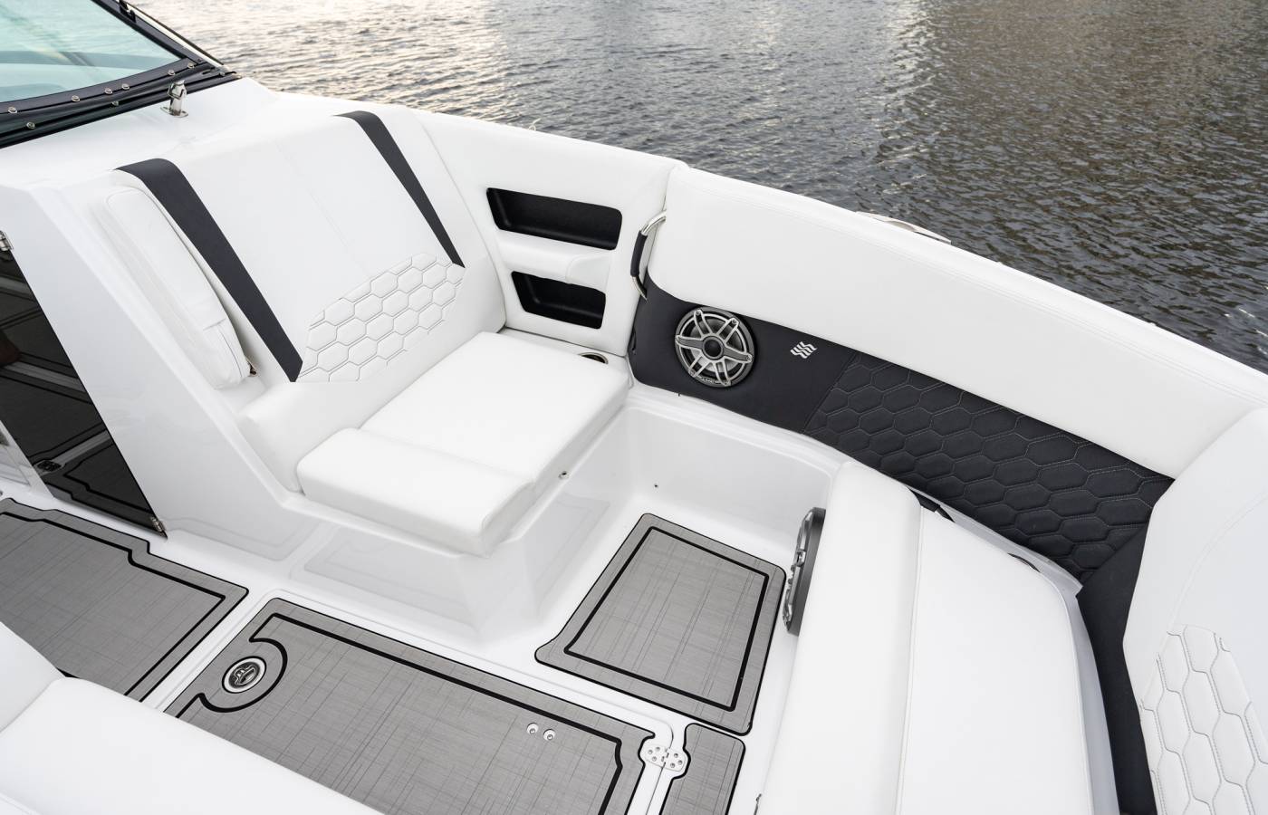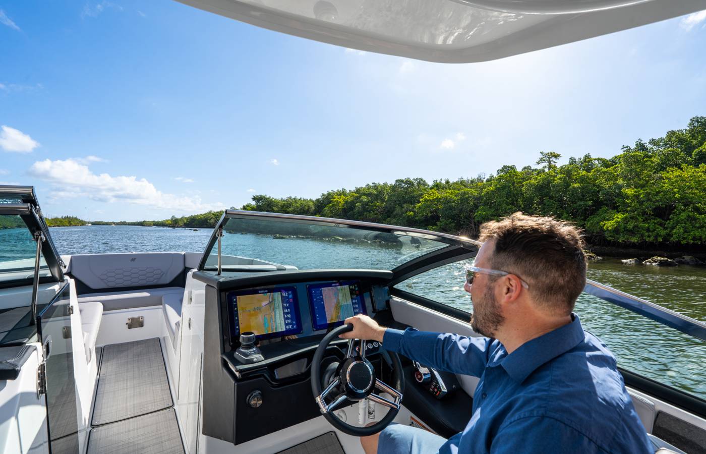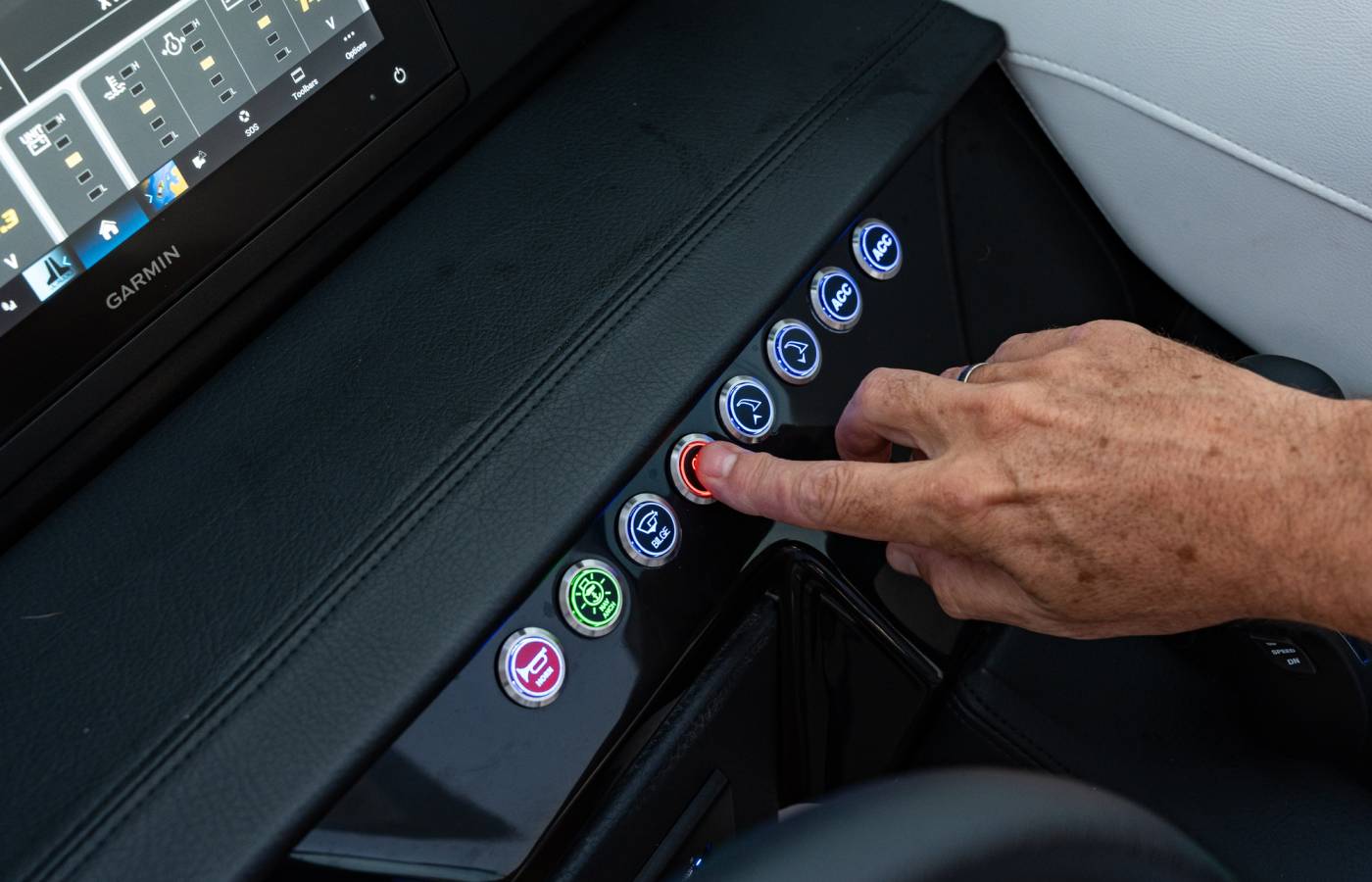 - Instrumentation, helm: twin 12" MFD touchscreen w/engine data, active trim control & monitoring, preloaded charts, audio control, transducer (water, temperature, sonar)