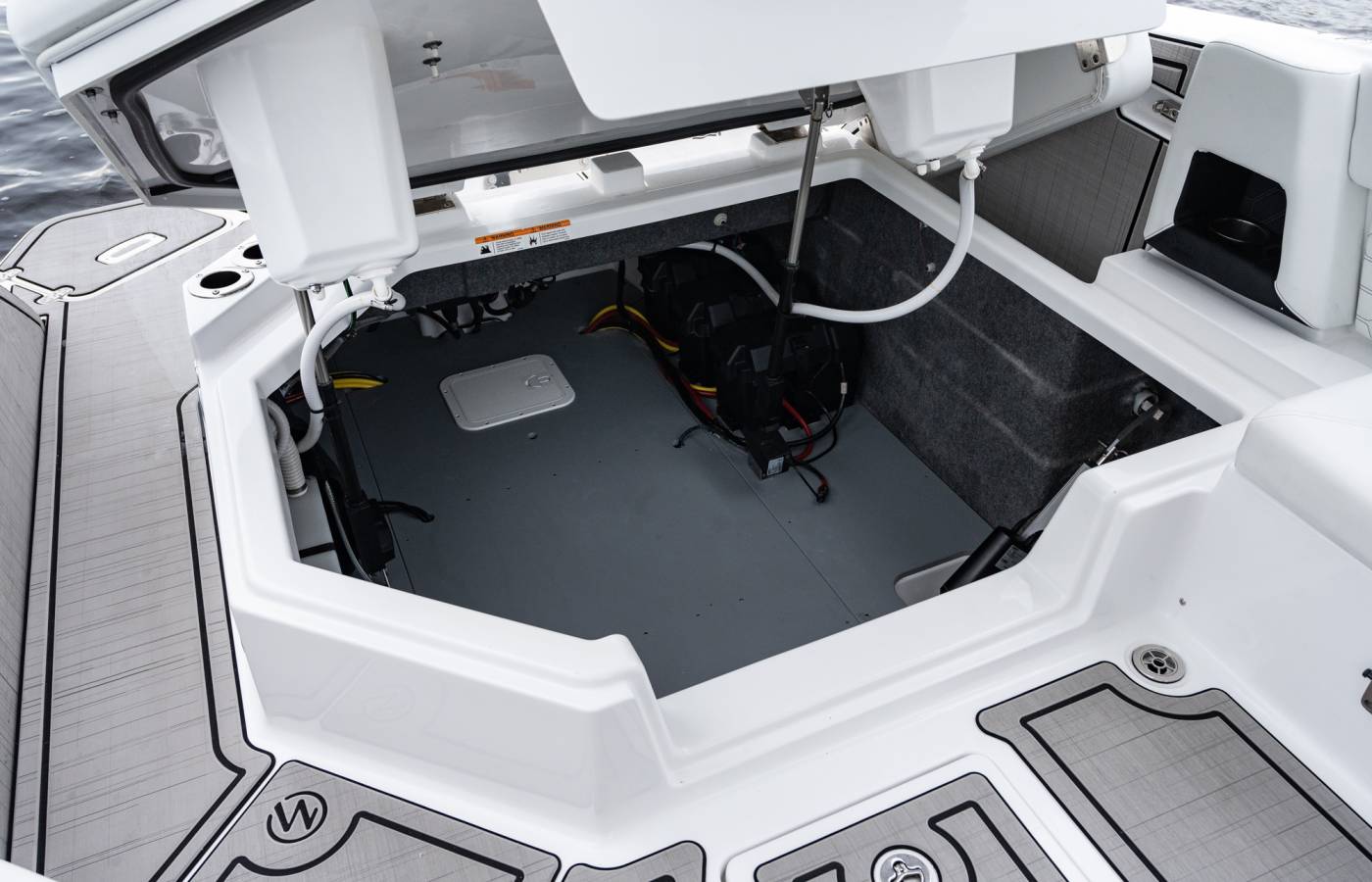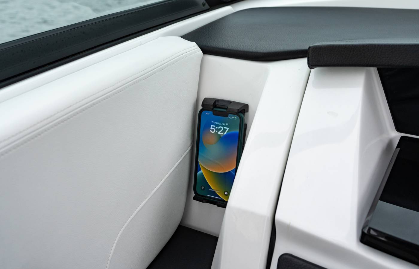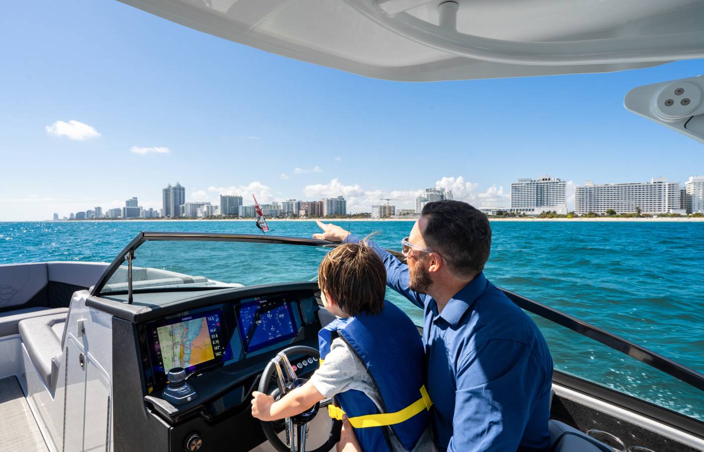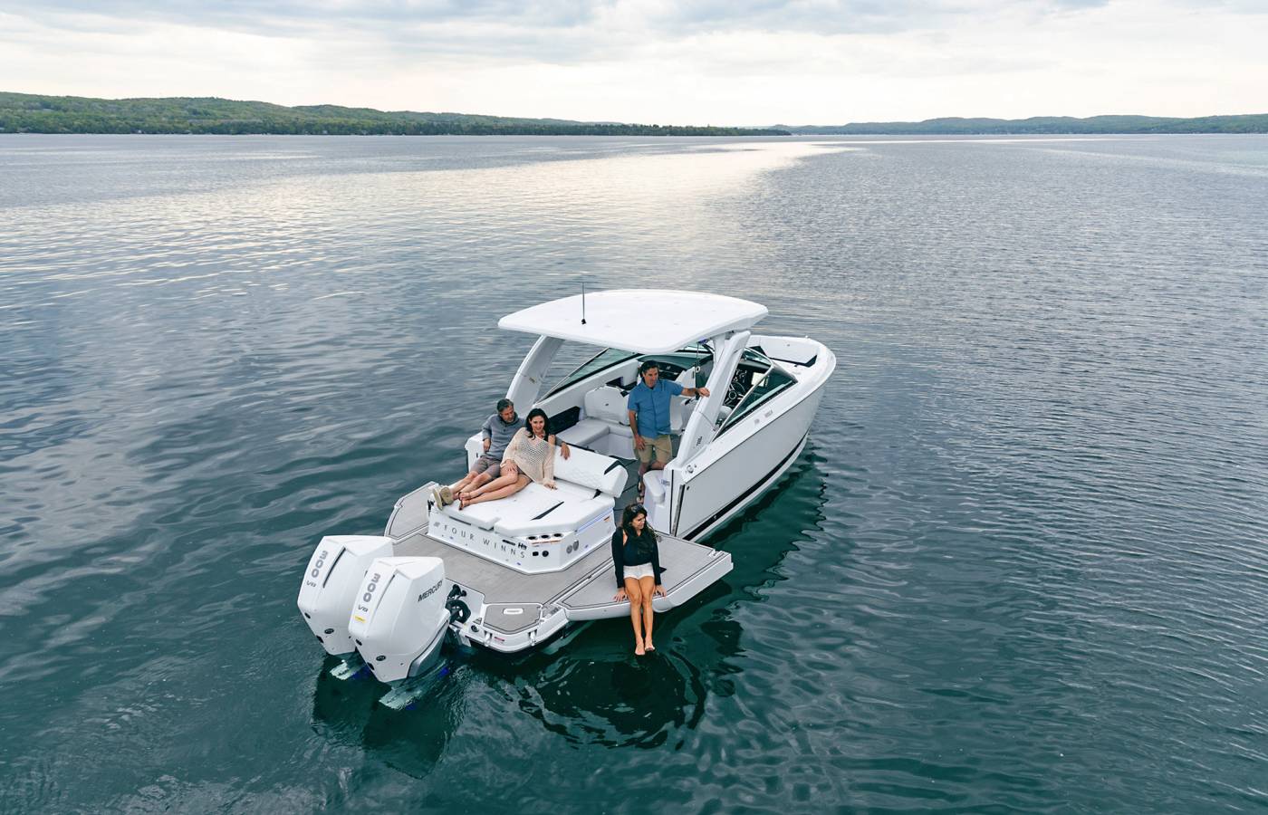 - Instrumentation, helm: twin 12" MFD touchscreen w/engine data, active trim control & monitoring, preloaded charts, audio control, transducer (water, temperature, sonar)