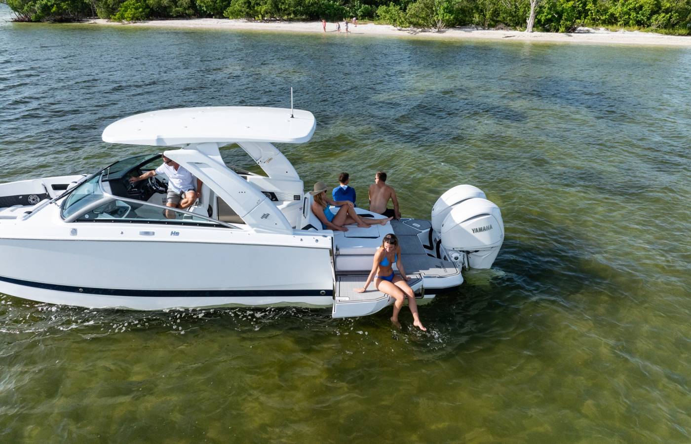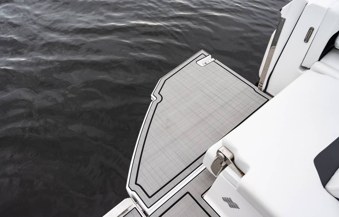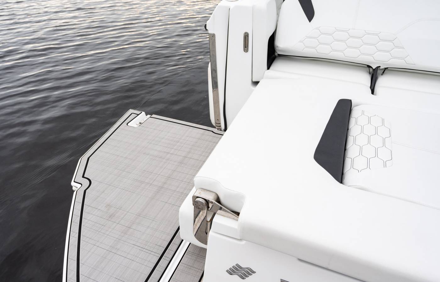 Fold-down terraces extend the cockpit outward, creating a spacious open platform for socializing, sunbathing, or enjoying easy access to the water. With the extra square footage, the boat transforms into the perfect entertainment setting.