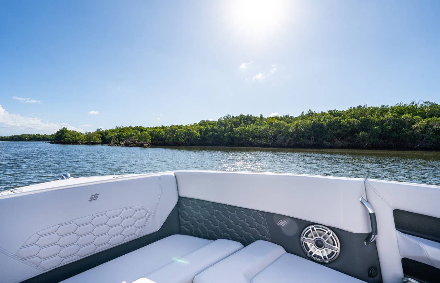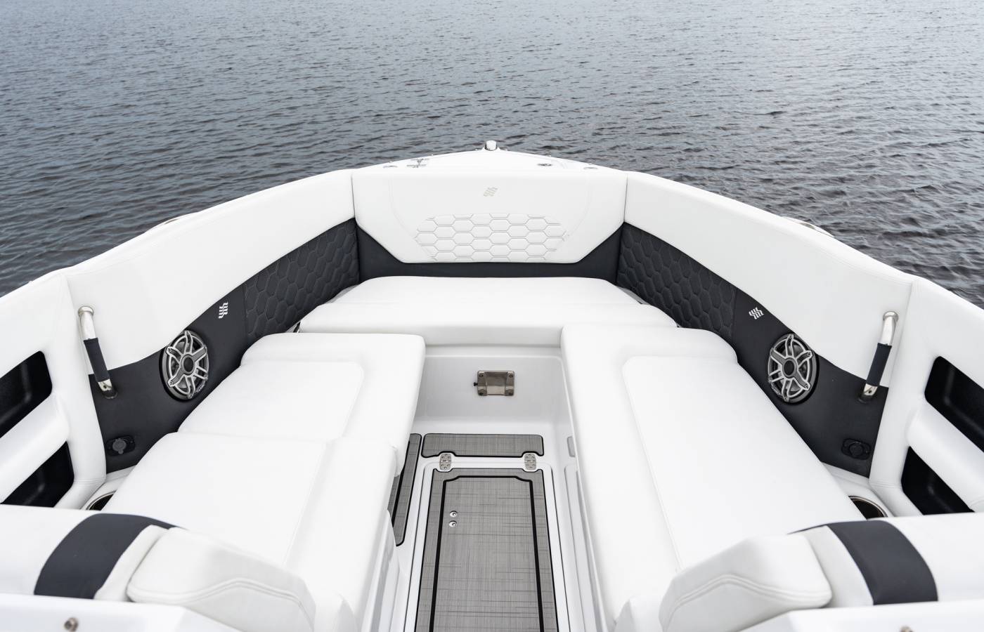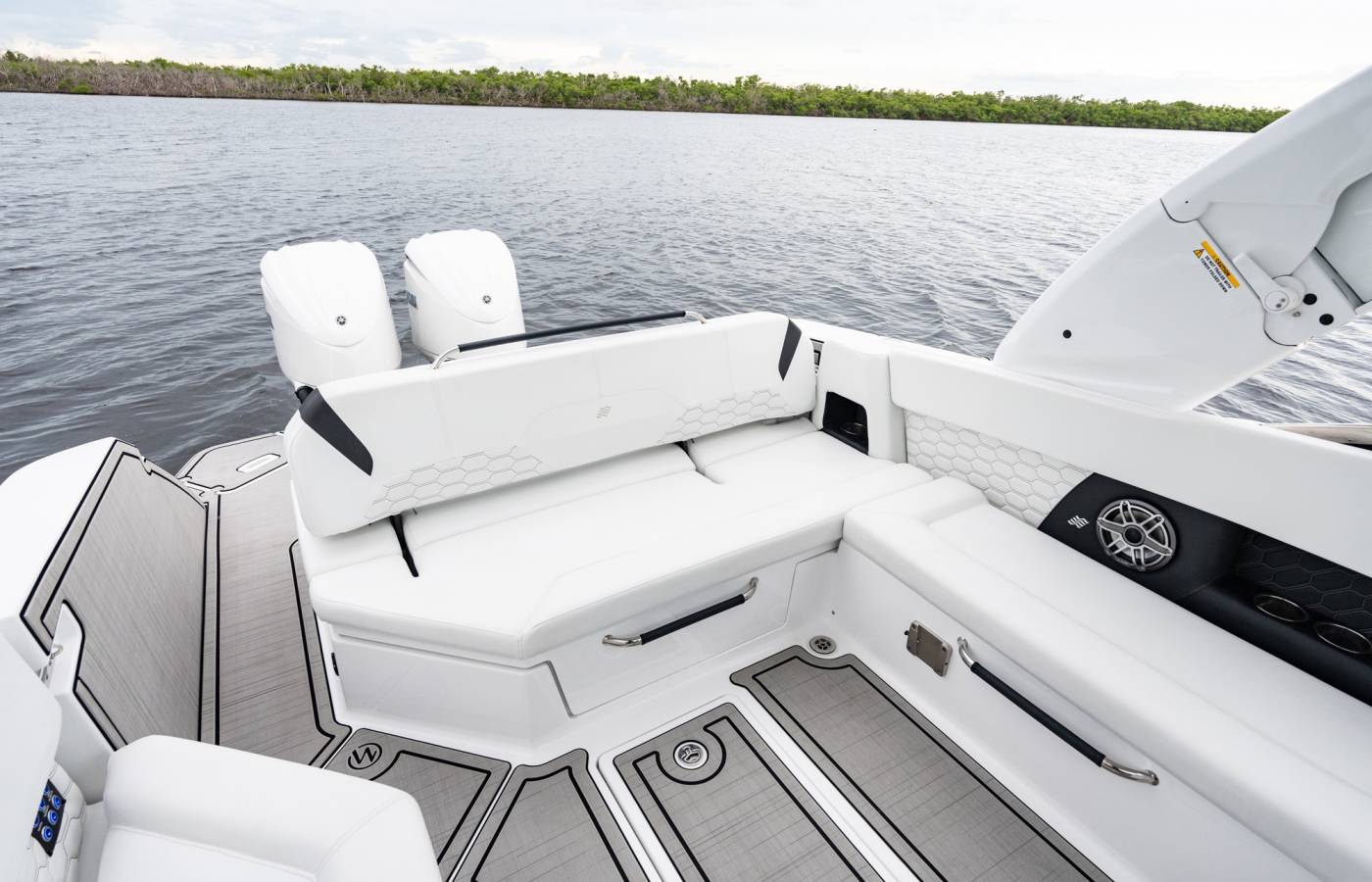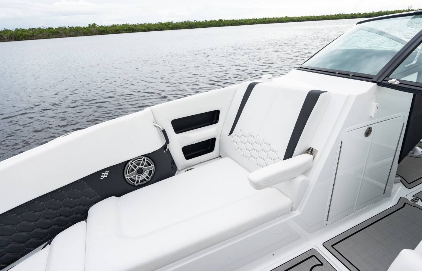 From rich upholstery and polished stainless accents to optional reed flooring, every surface reflects modern craftsmanship. The elevated finishes give the boat a distinctly refined, yacht-like atmosphere.