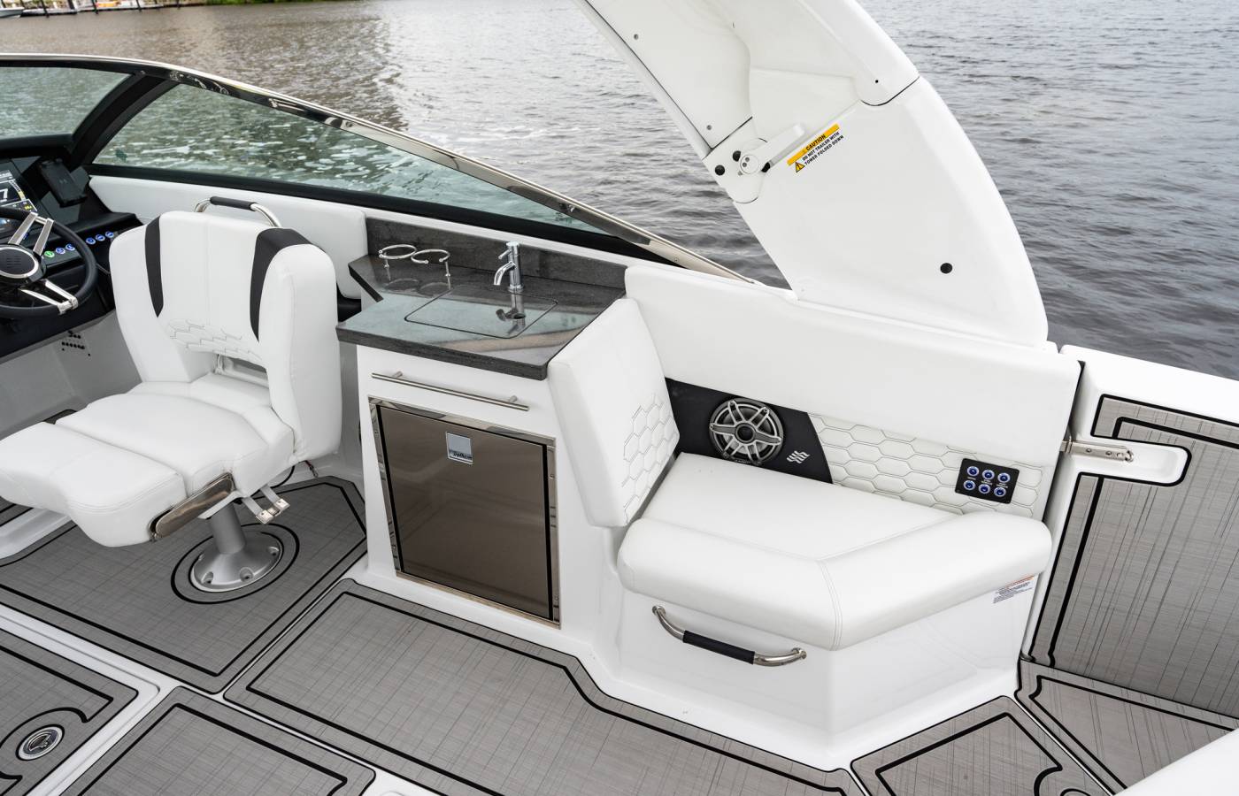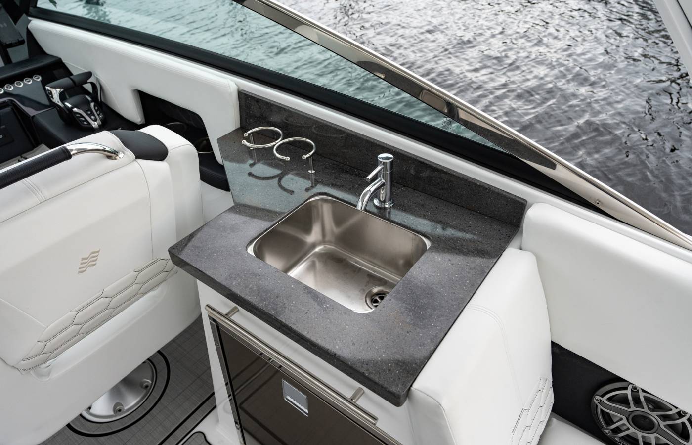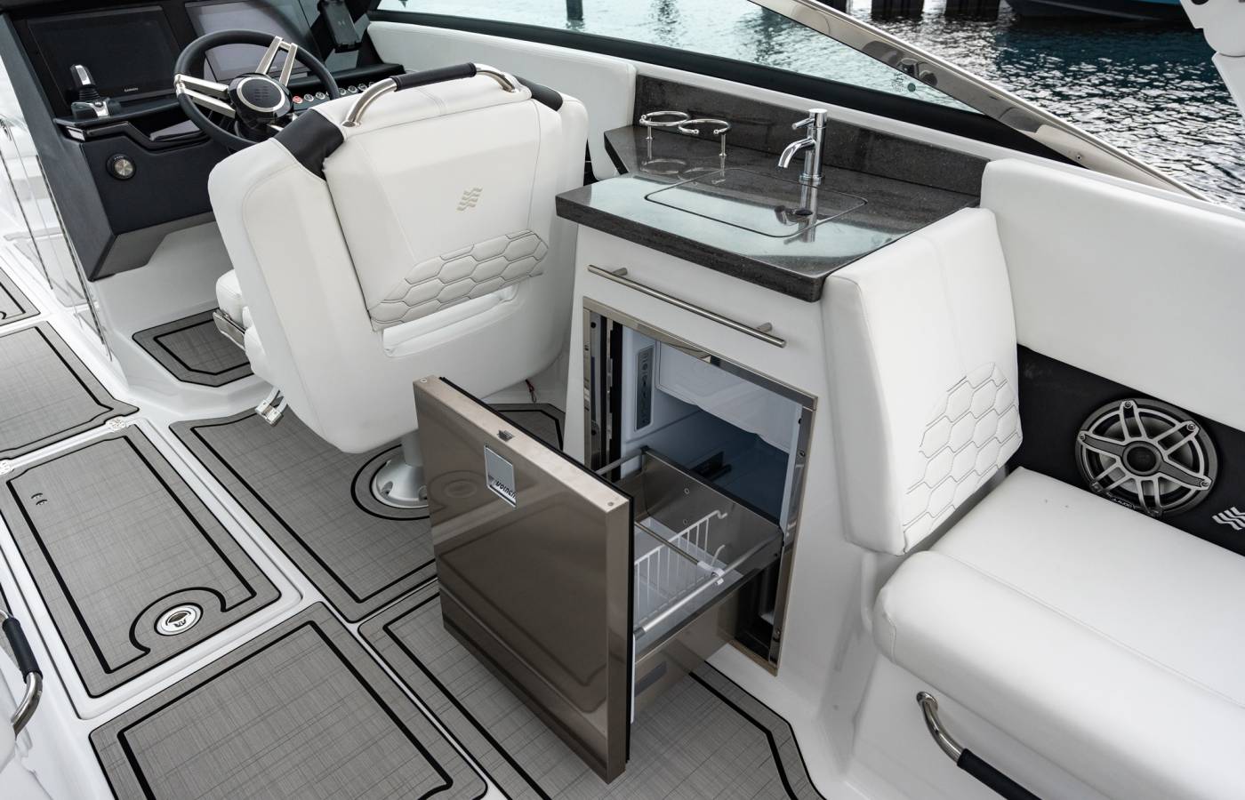 A refrigerator and sink are seamlessly integrated to make entertaining on the water simple and enjoyable. Combined with stainless drink holders, coolers, and courtesy lighting, the boat is as practical as it is luxurious.