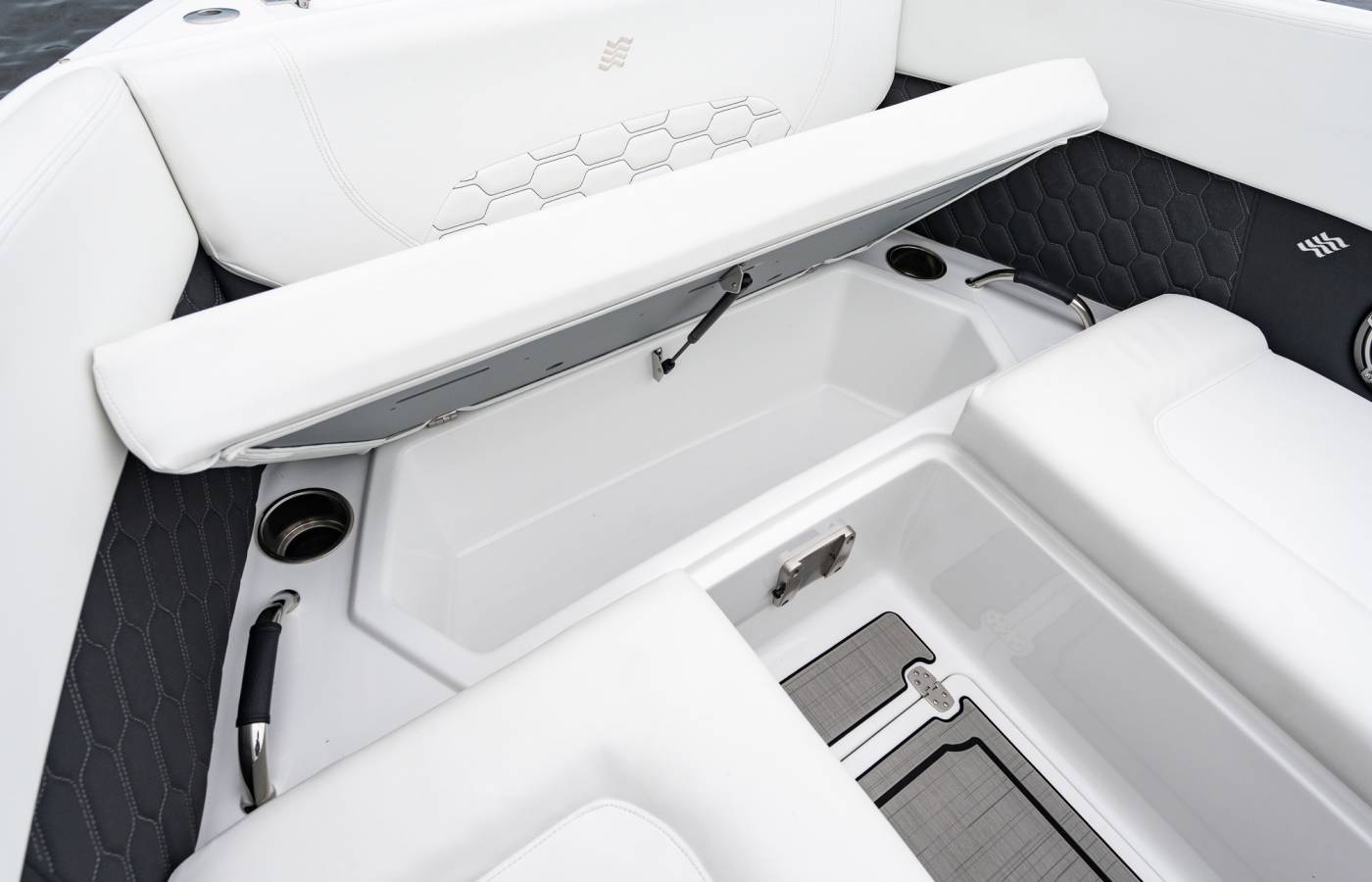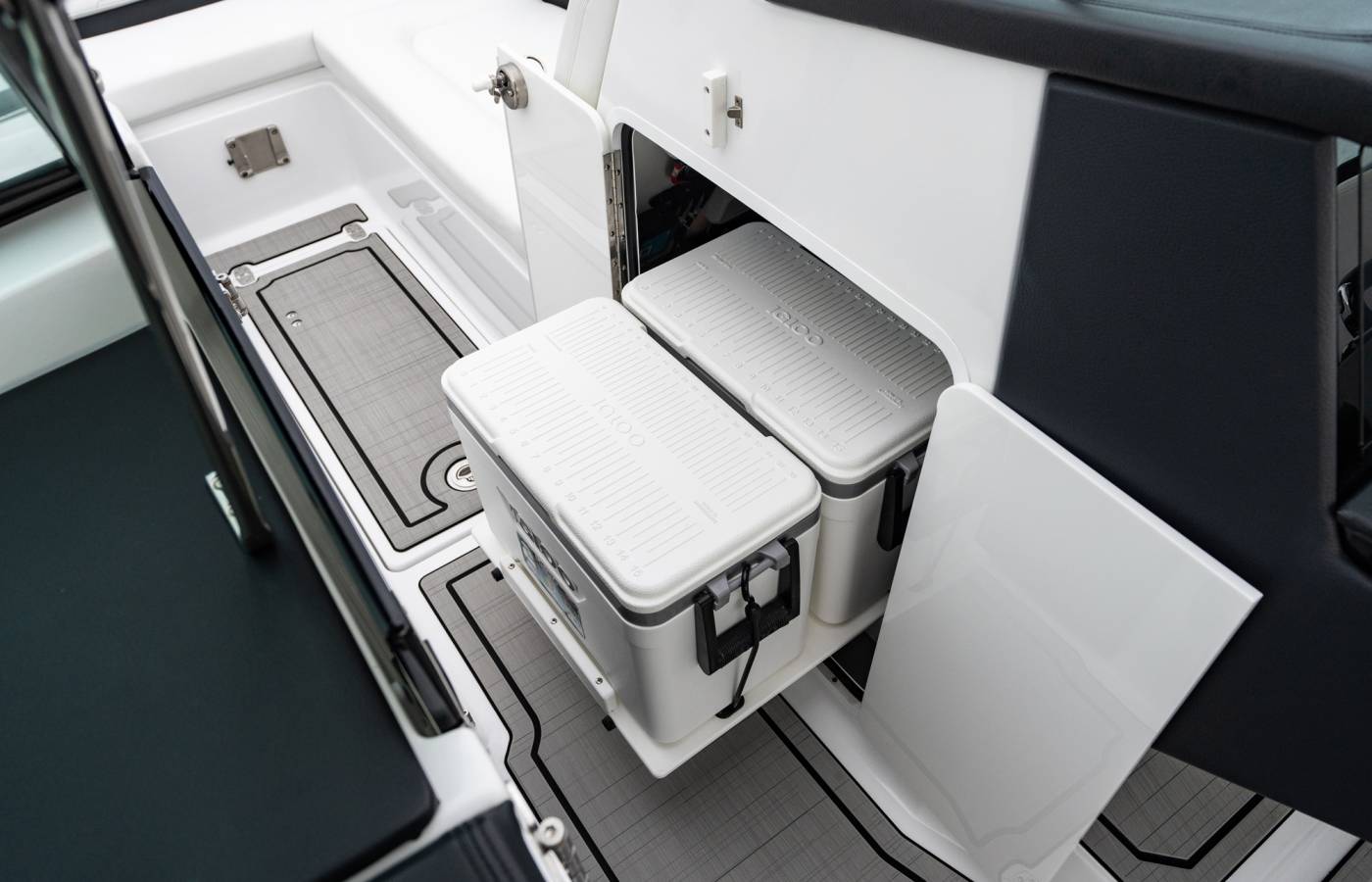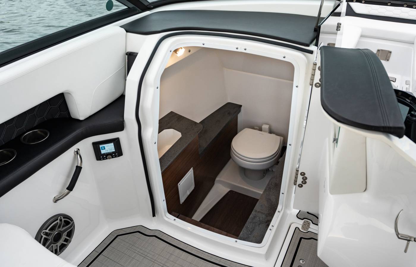 A refrigerator and sink are seamlessly integrated to make entertaining on the water simple and enjoyable. Combined with stainless drink holders, coolers, and courtesy lighting, the boat is as practical as it is luxurious.