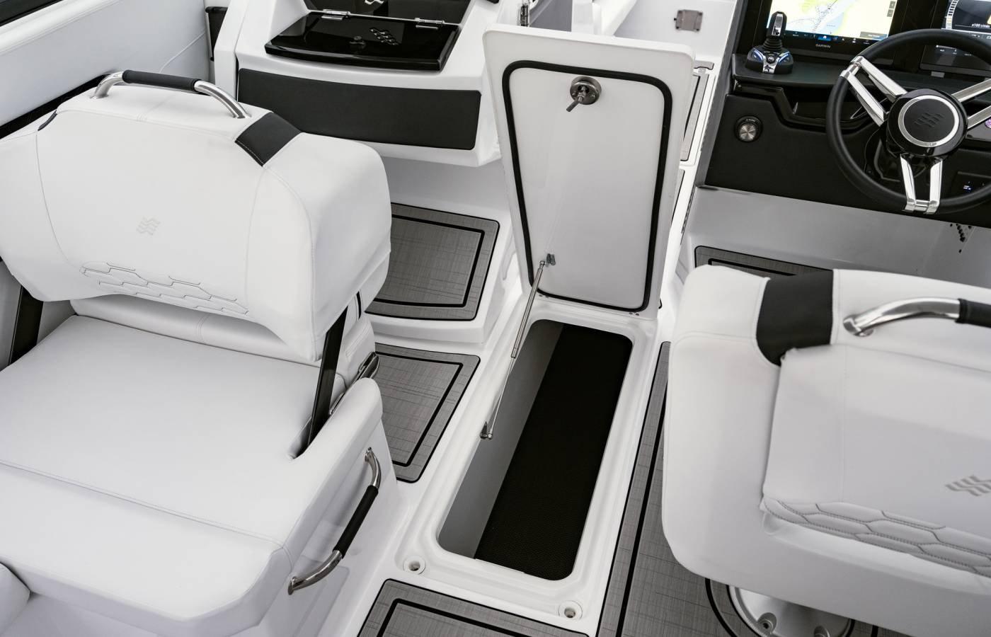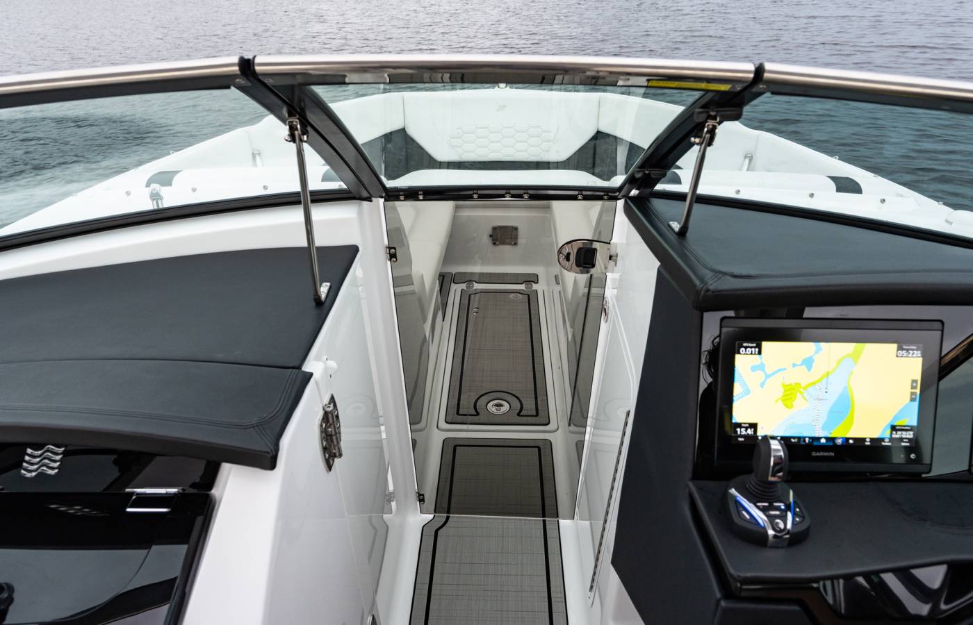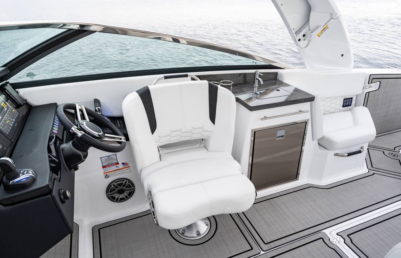 The helm features a wide dash with room for large touchscreen displays, ergonomic controls, and a supportive captain’s chair. Together, these details provide clear sightlines, intuitive operation, and precise handling underway.
