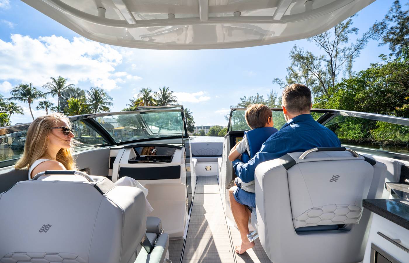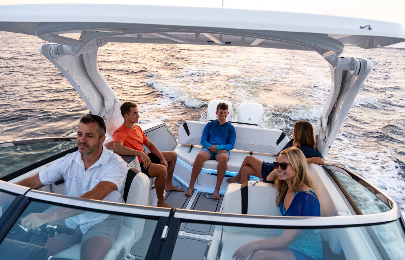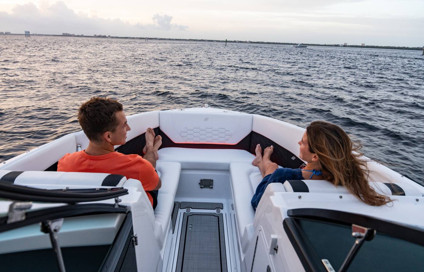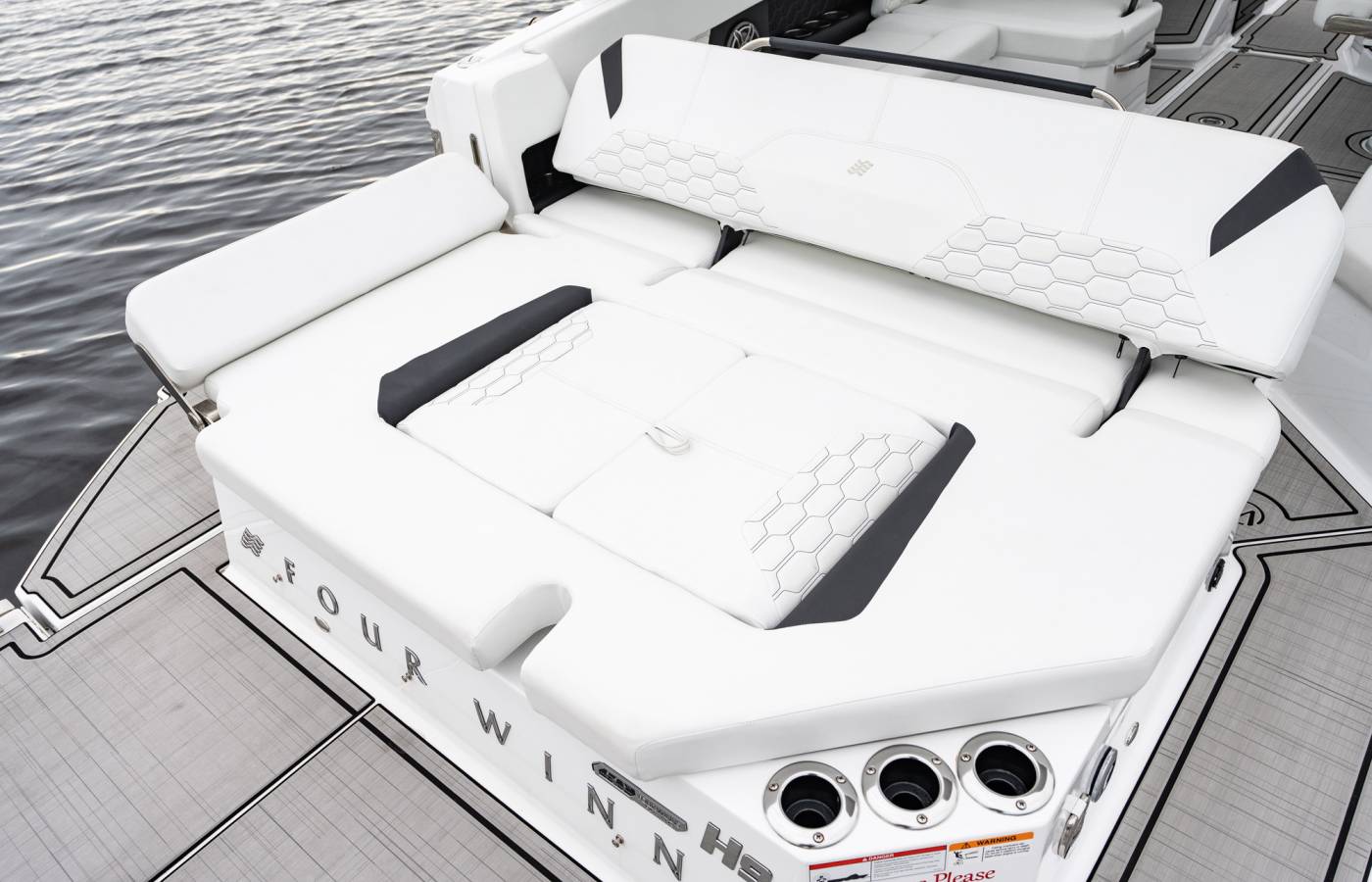 Generously cushioned seating with adjustable backrests allows for multiple arrangements, from forward-facing cruising to aft-facing lounging. This flexibility ensures comfort and connection no matter how the day unfolds.