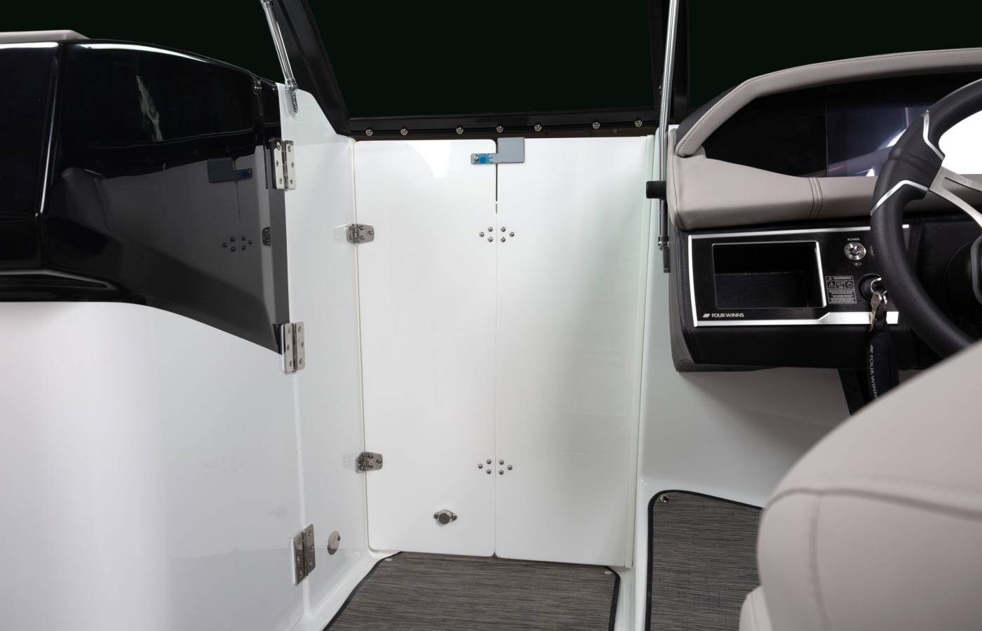 - Windshield with walk-thru, full-height, curved glass, exclusive design