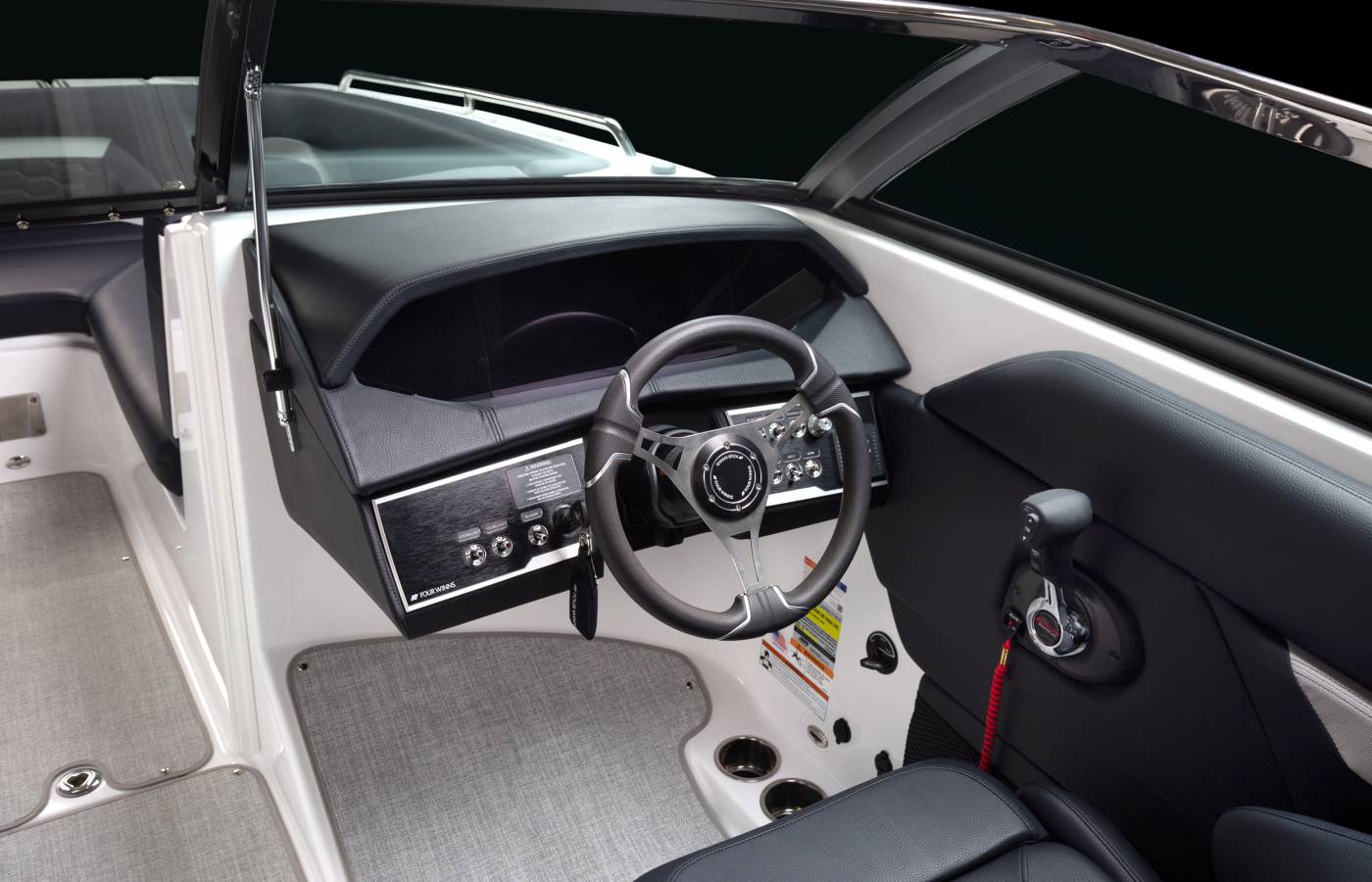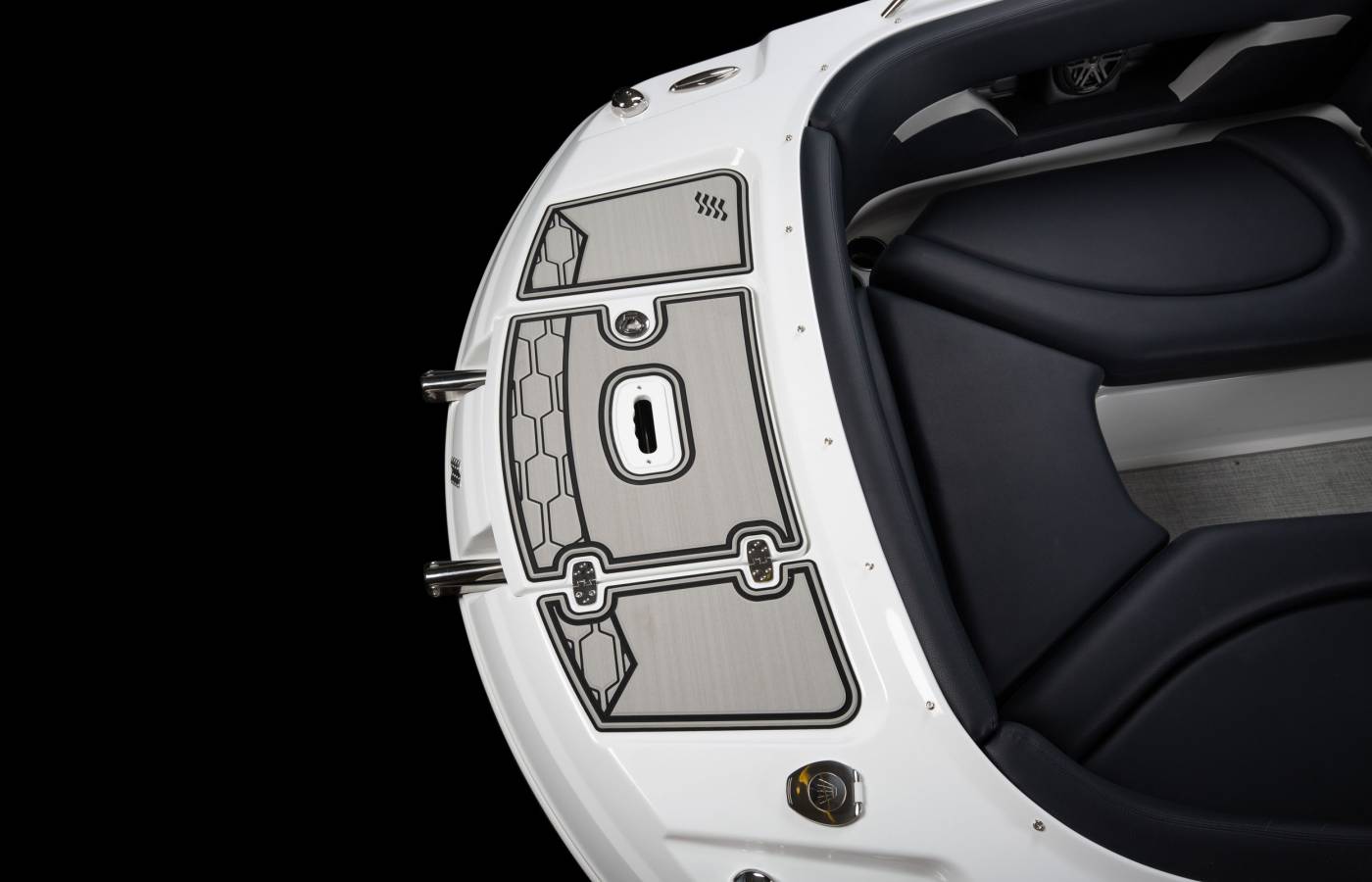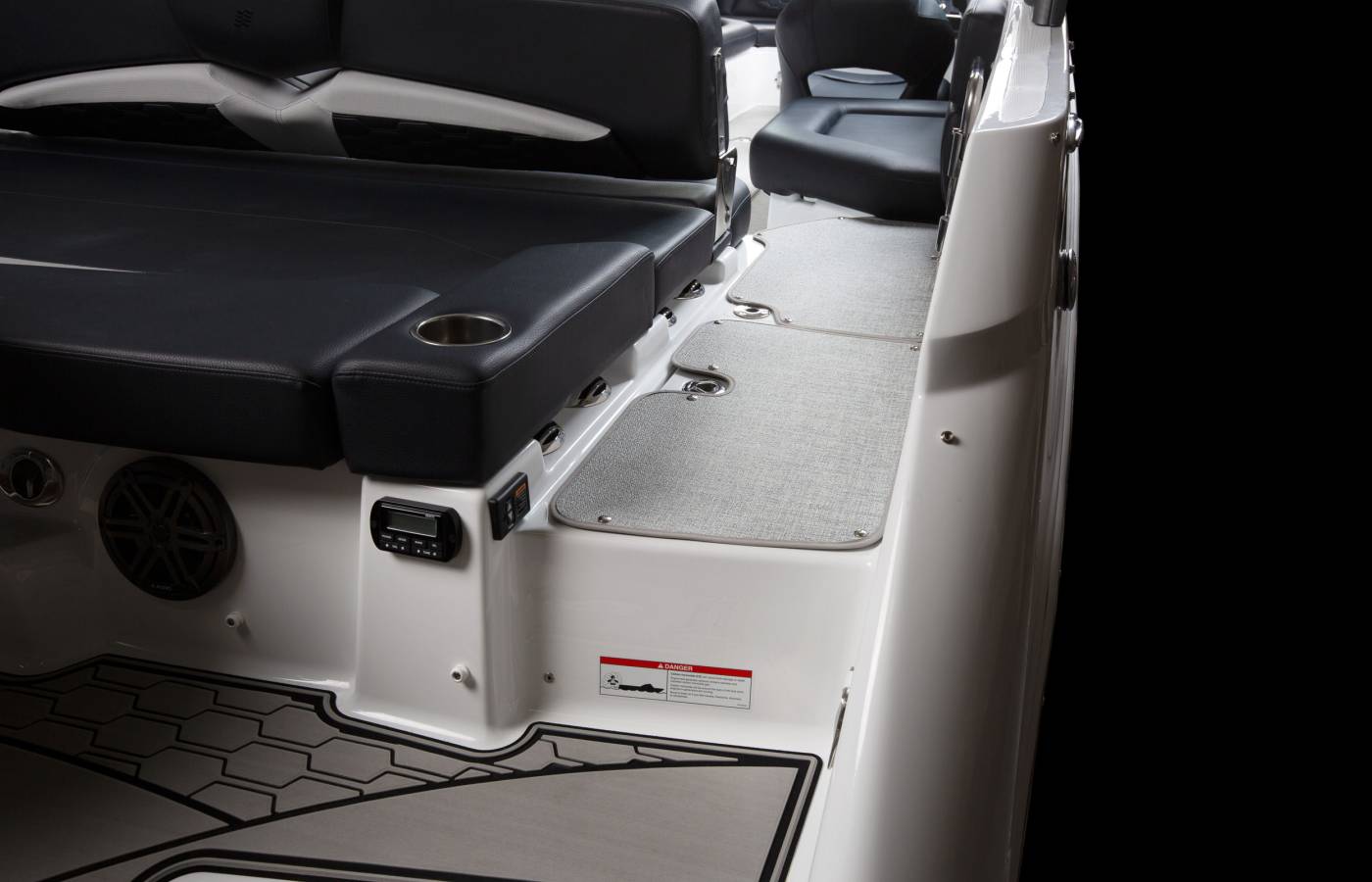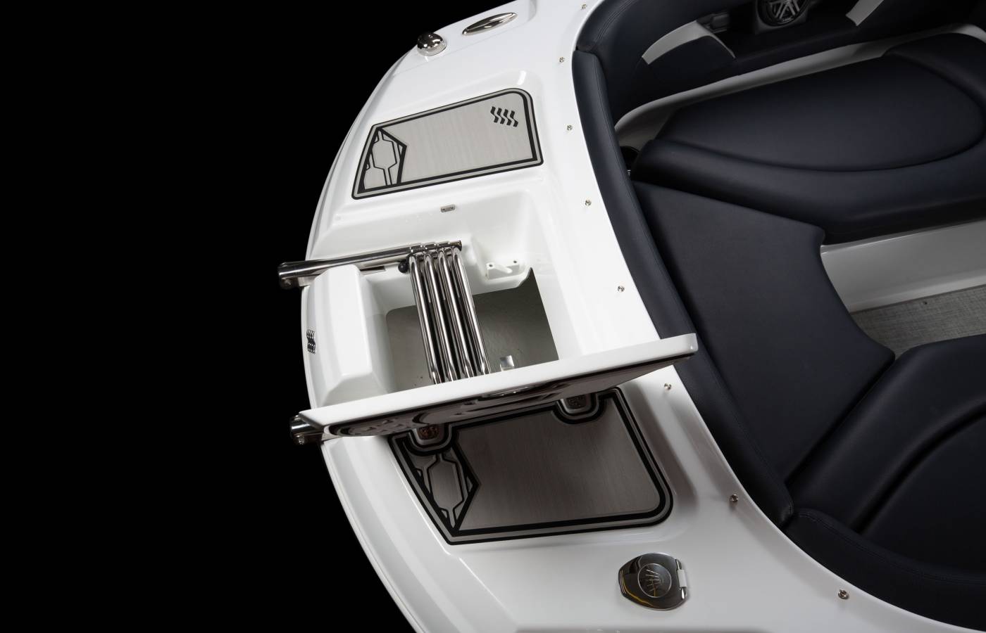 An advanced forward-facing drive adds extra bite off the line, delivers trim authority, boosts fuel economy, and keeps the prop tucked safely under the boat—peace of mind for swimmers around the platform.