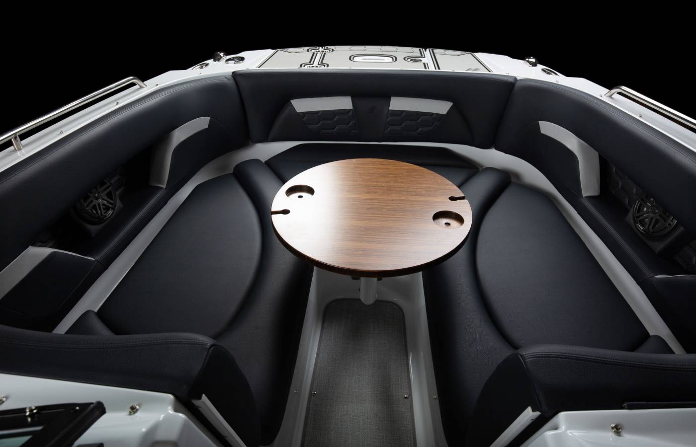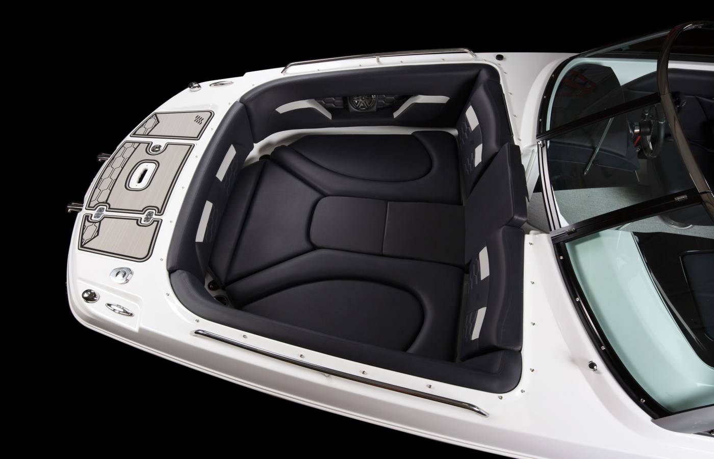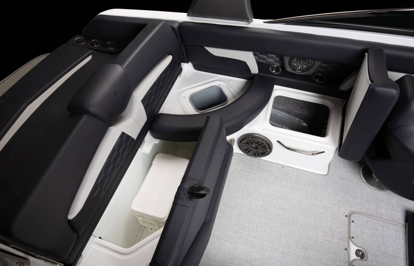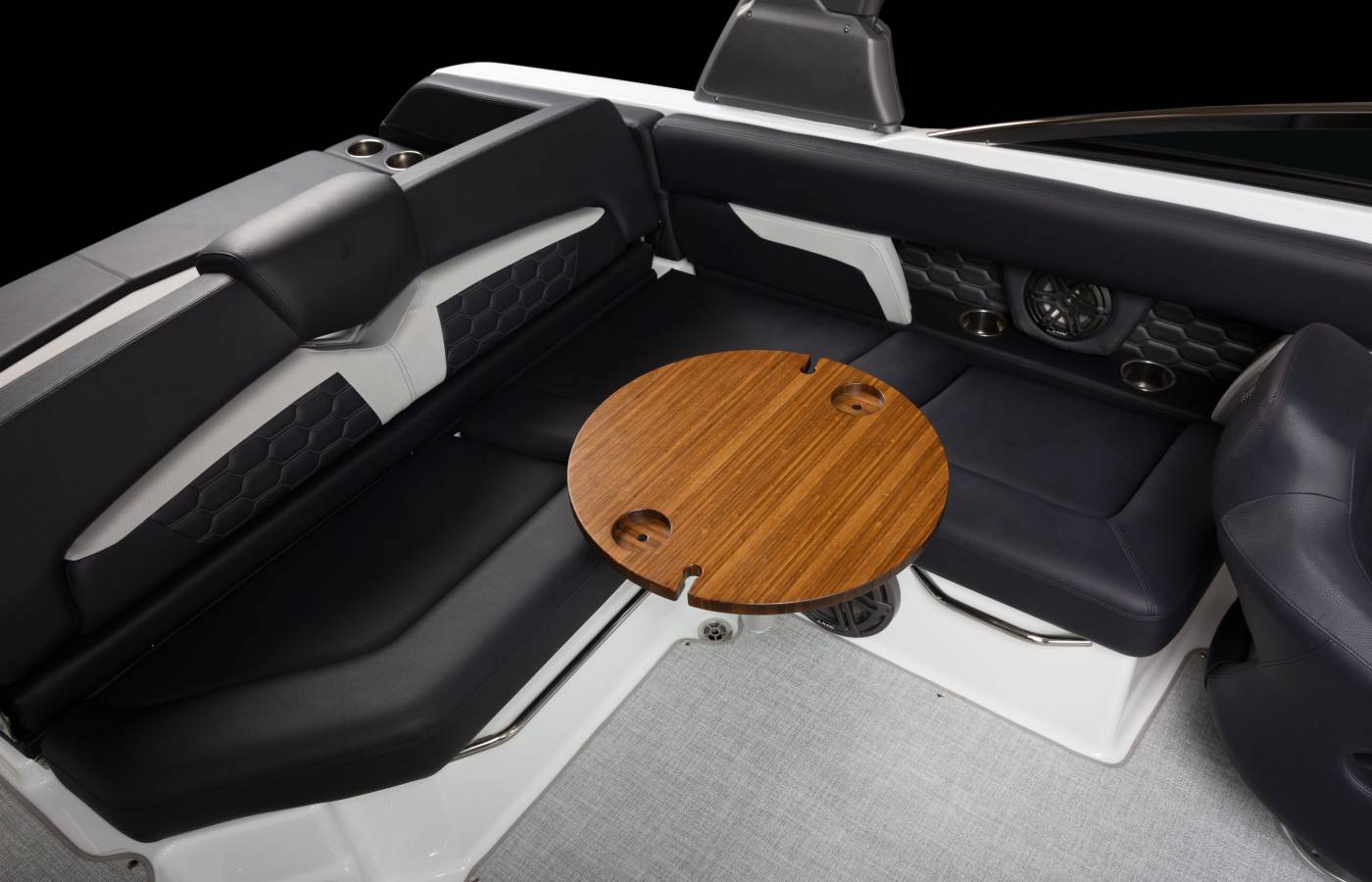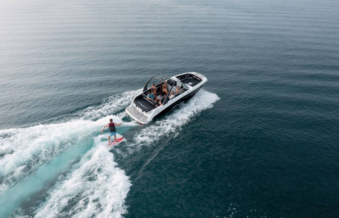 An advanced forward-facing drive adds extra bite off the line, delivers trim authority, boosts fuel economy, and keeps the prop tucked safely under the boat—peace of mind for swimmers around the platform.