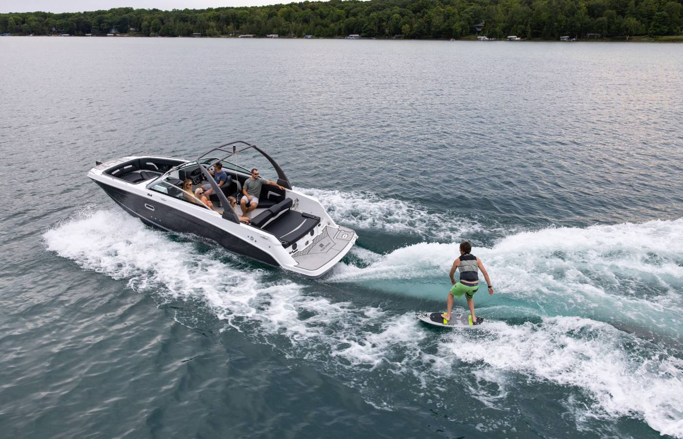 Luxury wake performance, unmatched in the category. Wake tabs, integrated ballast, and a unique Volvo Penta forward-drive system work in unison to build surf wakes with superior height and push.