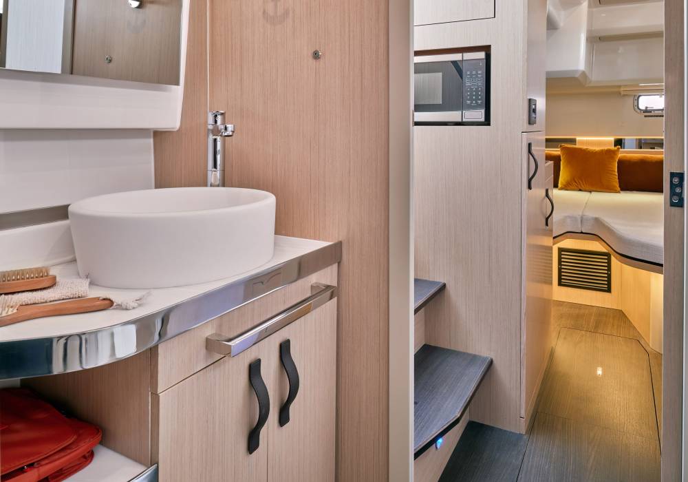 Designed for entertaining, the open-air galley connects seamlessly with the cockpit, featuring premium appliances and ample prep space so meals and refreshments are always within reach.