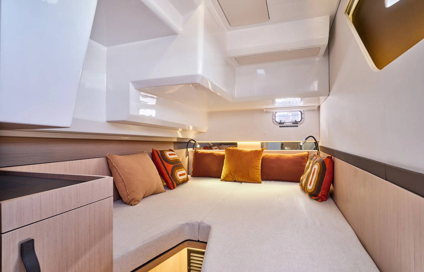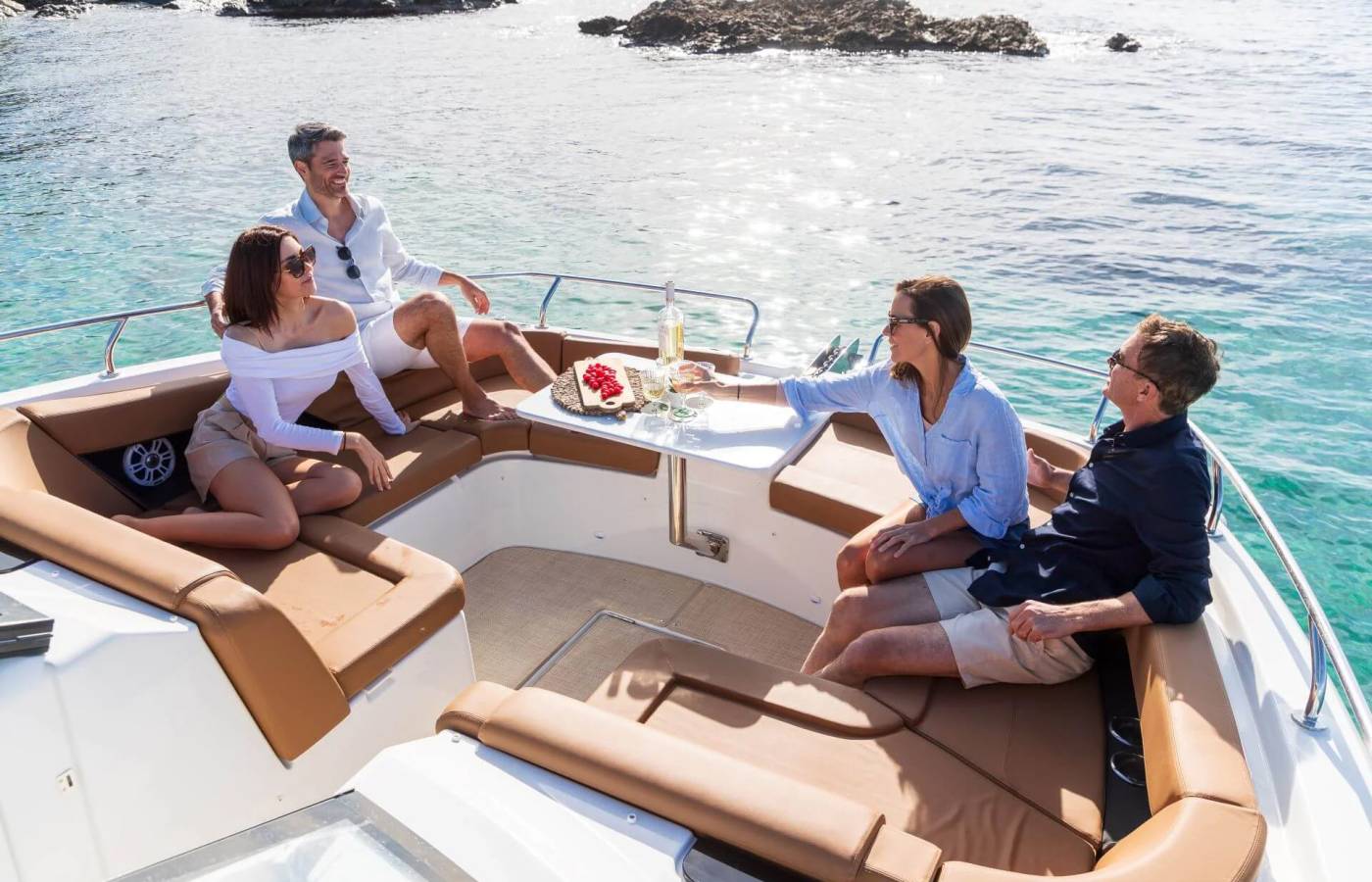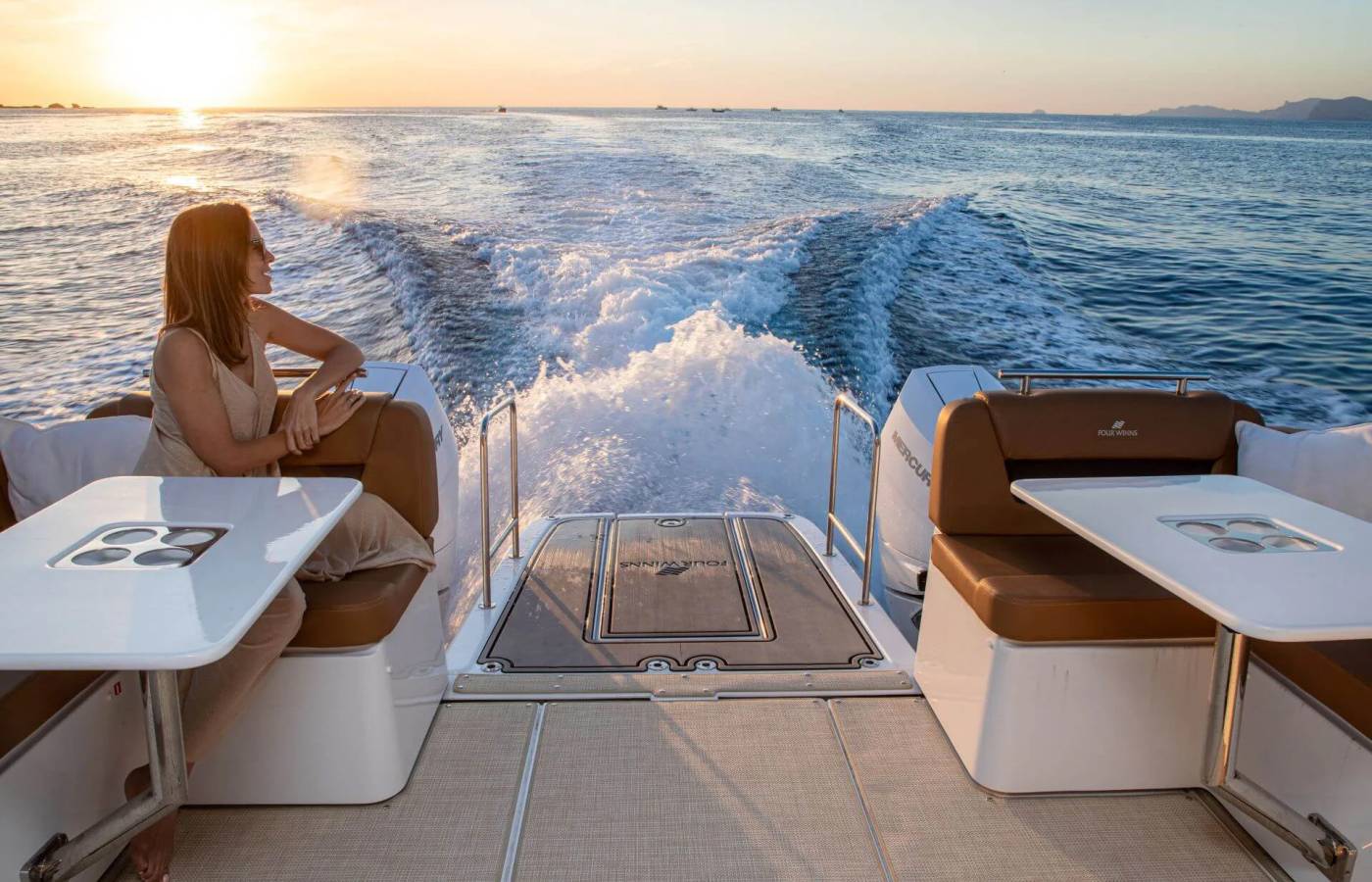 The TH38 accommodates up to 15 guests across its generous 14’7” beam and more than 169 square feet of deck space, providing plenty of room to relax, entertain, and enjoy the open water in style. Its intuitive joystick piloting, dual digital displays, and advanced helm layout make maneuvering effortless, even in tight spots. Forward-facing, hand-stitched cockpit seating ensures both the captain and co-pilot can operate the boat comfortably while staying engaged with their guests.
