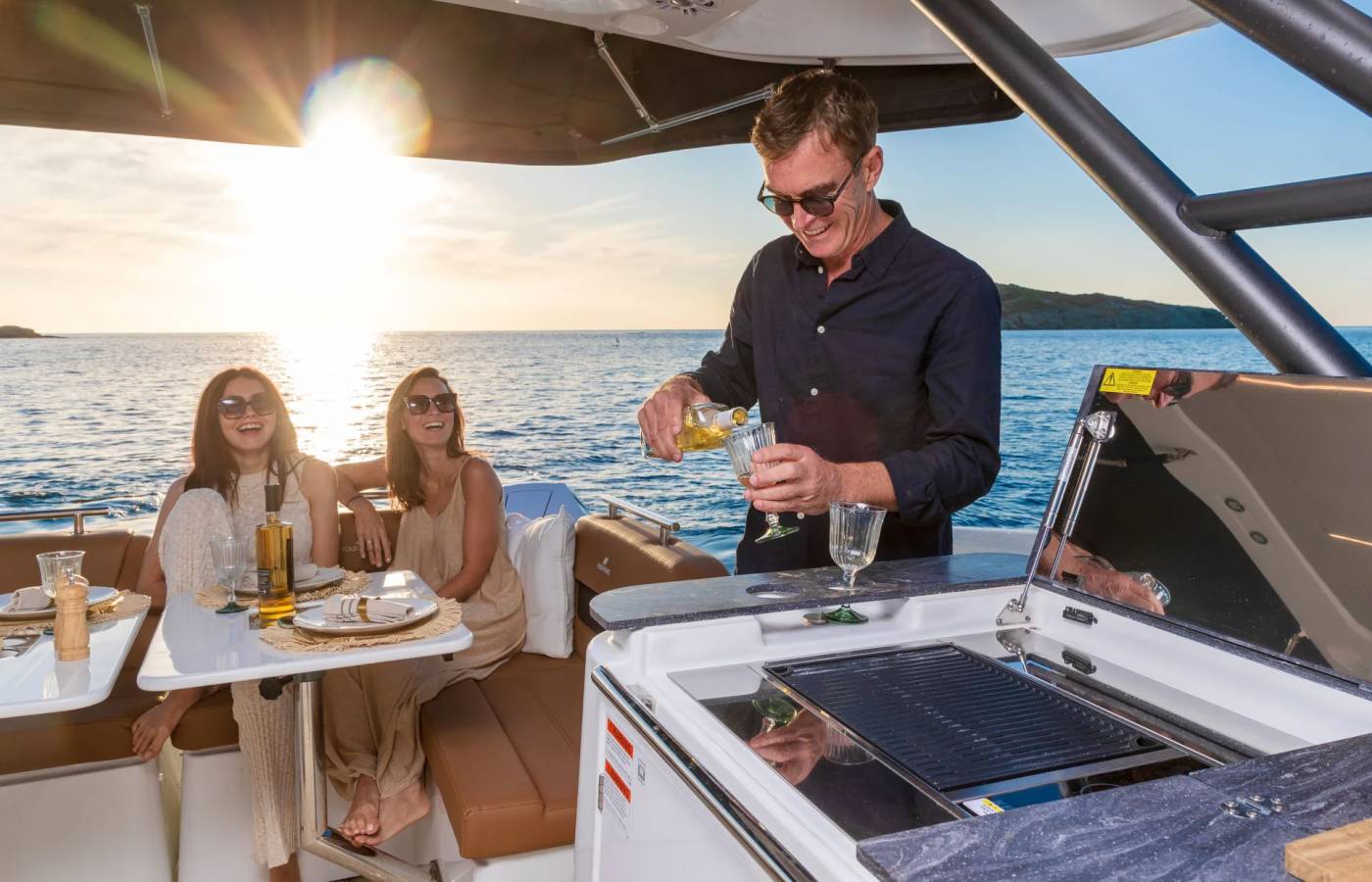 The central galley features a sink, trash compartment, refrigerator, and an optional electric grill. Positioned thoughtfully within the living area, it offers convenient access for guests and seamless functionality during onboard entertaining.