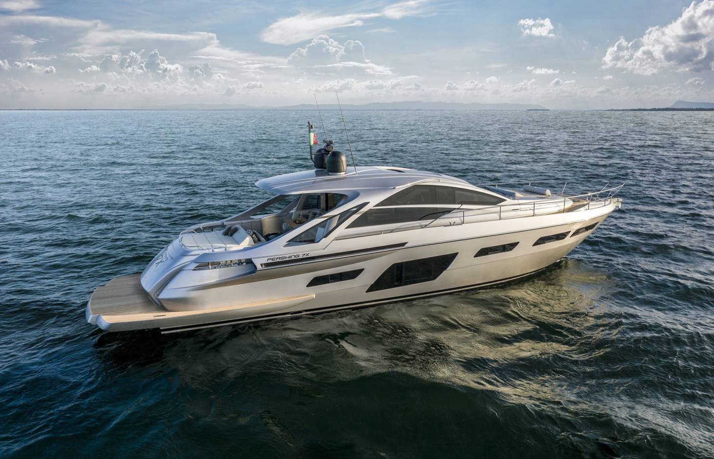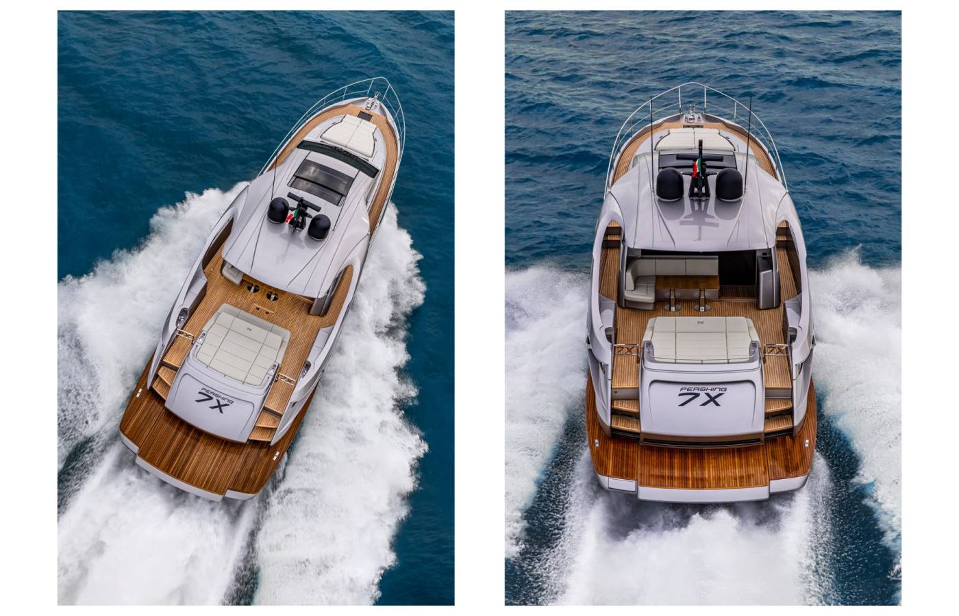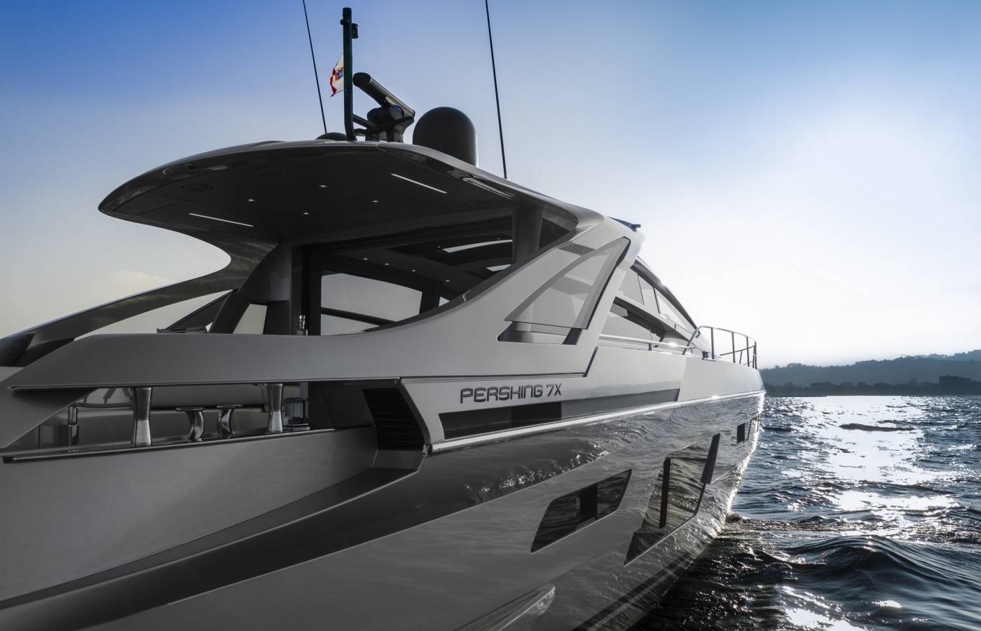 The Pershing 7X channels lightweight, carbon-rich construction into a pure, sporting silhouette. Sleek, aggressive lines are sharpened by a metallic Alusilver livery option, while sculpted bulwark openings that cloak the air exhausts sweep aft into pronounced lateral “muscles”—a race-car cue translated for the sea. The result is taut, technical, and unmistakably Pershing.