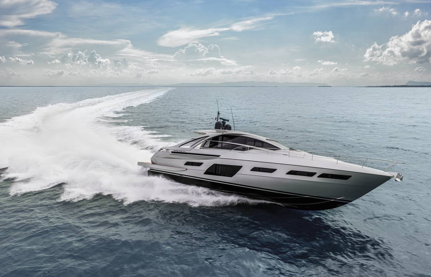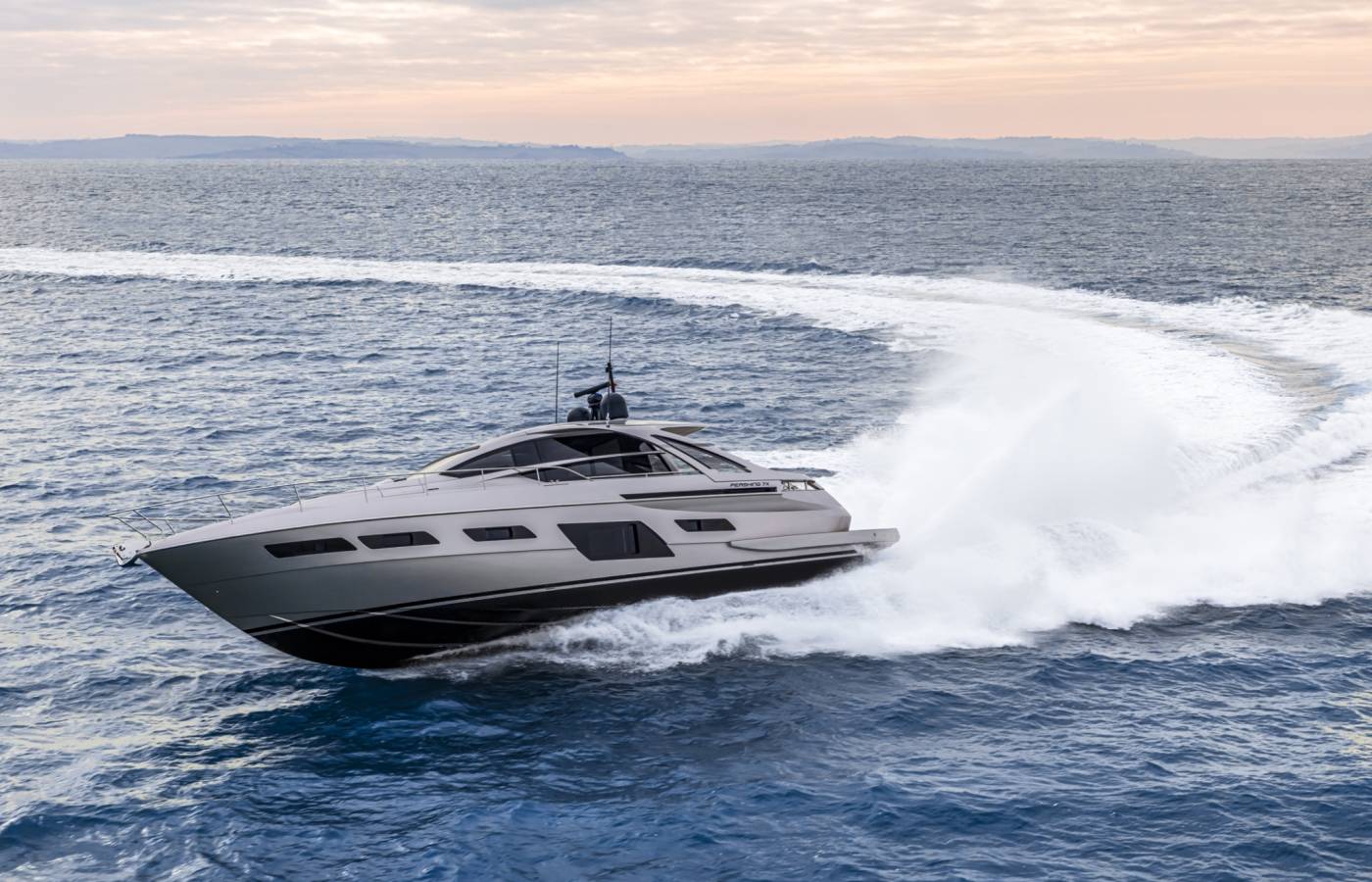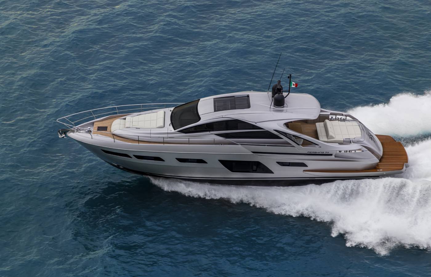 The Pershing 7X channels lightweight, carbon-rich construction into a pure, sporting silhouette. Sleek, aggressive lines are sharpened by a metallic Alusilver livery option, while sculpted bulwark openings that cloak the air exhausts sweep aft into pronounced lateral “muscles”—a race-car cue translated for the sea. The result is taut, technical, and unmistakably Pershing.